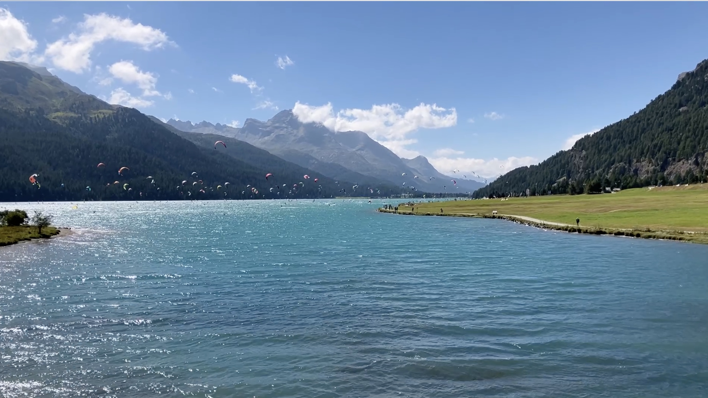 Es war vor dem Wetterwechsel ein ziemlicher Fönsturm, die Kitesurfer am Silvaplanasee bei St. Moritz feierten die Bedingungen in großen Massen.