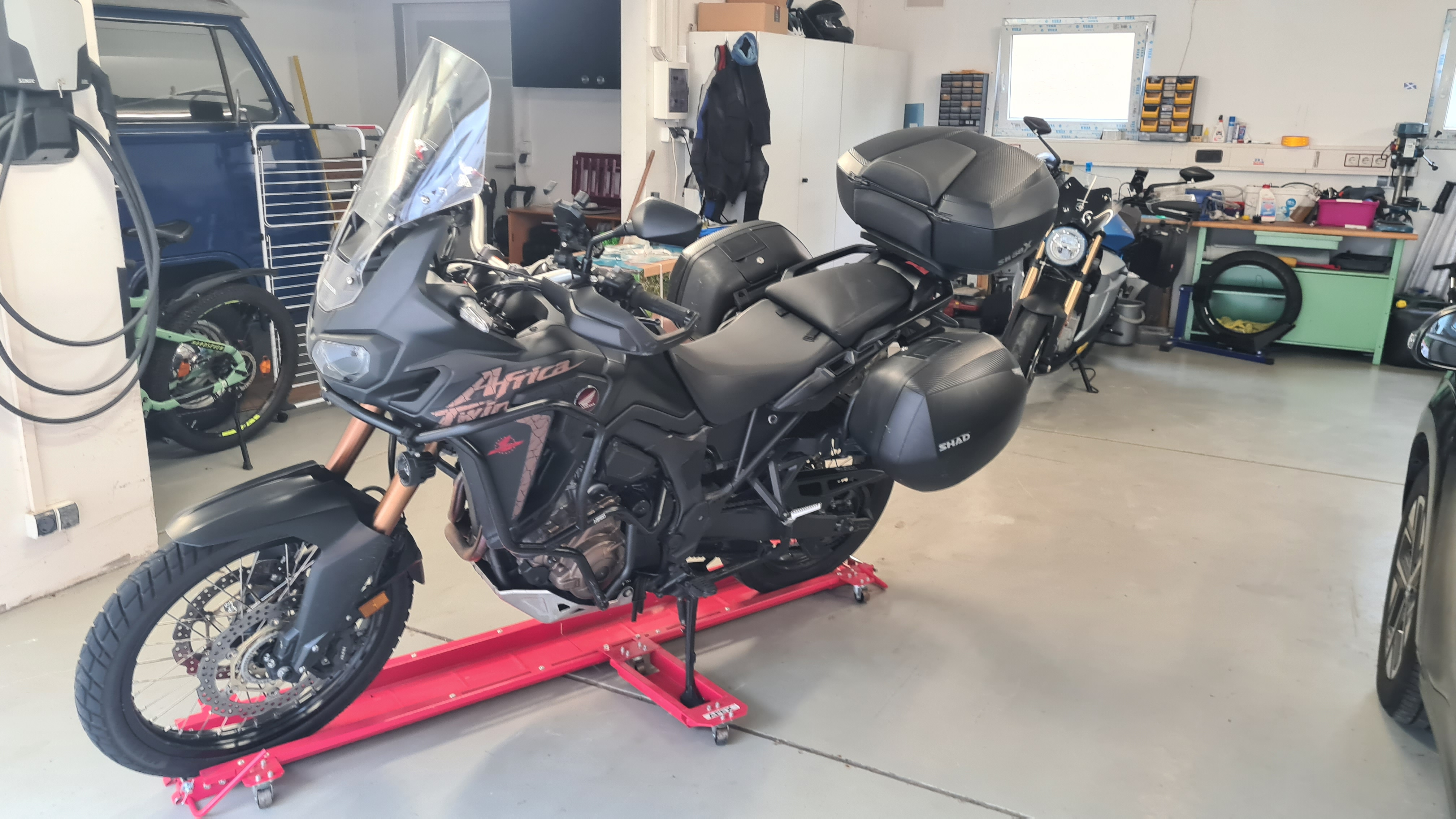 Für einen sicheren Stand musste meine K1200 Montageplatte und eine Terrassenplatte herhalten. Wollte nicht in der Garagenboden bohren.