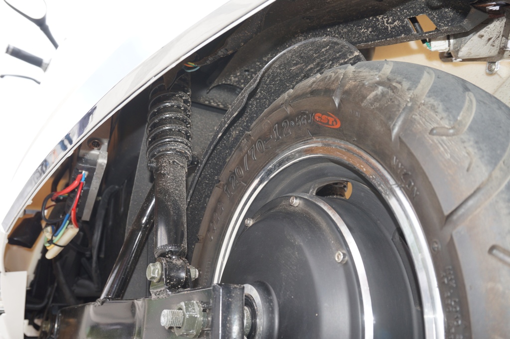 und an Spritzschutz am Hinterrad wurde der sportlich wirkenden Optik halber im Gegensatz zum Vorderrad (wirkt hier schon fast klobig) auch gespart, da lobe ich mir meinen selbst entworfenen. Stoßdämpfer, Akkukasten, Controller, Rückleuchten bleiben sauber (bin aber auch Ganzjahres-Fahrer). Die Achse wird oft (bei meinem Modell zumindest, das dürfte bei vielen "aus Benzinroller mache Elektroroller" so sein) nach hinten verlängert, wodurch das Hinterrad dem Akkukasten Pltzmacht, aber die hintere Verkleidung den Dreck nicht mehr auffängt und sich Einiges an Rücken und Helm niederschlägt.