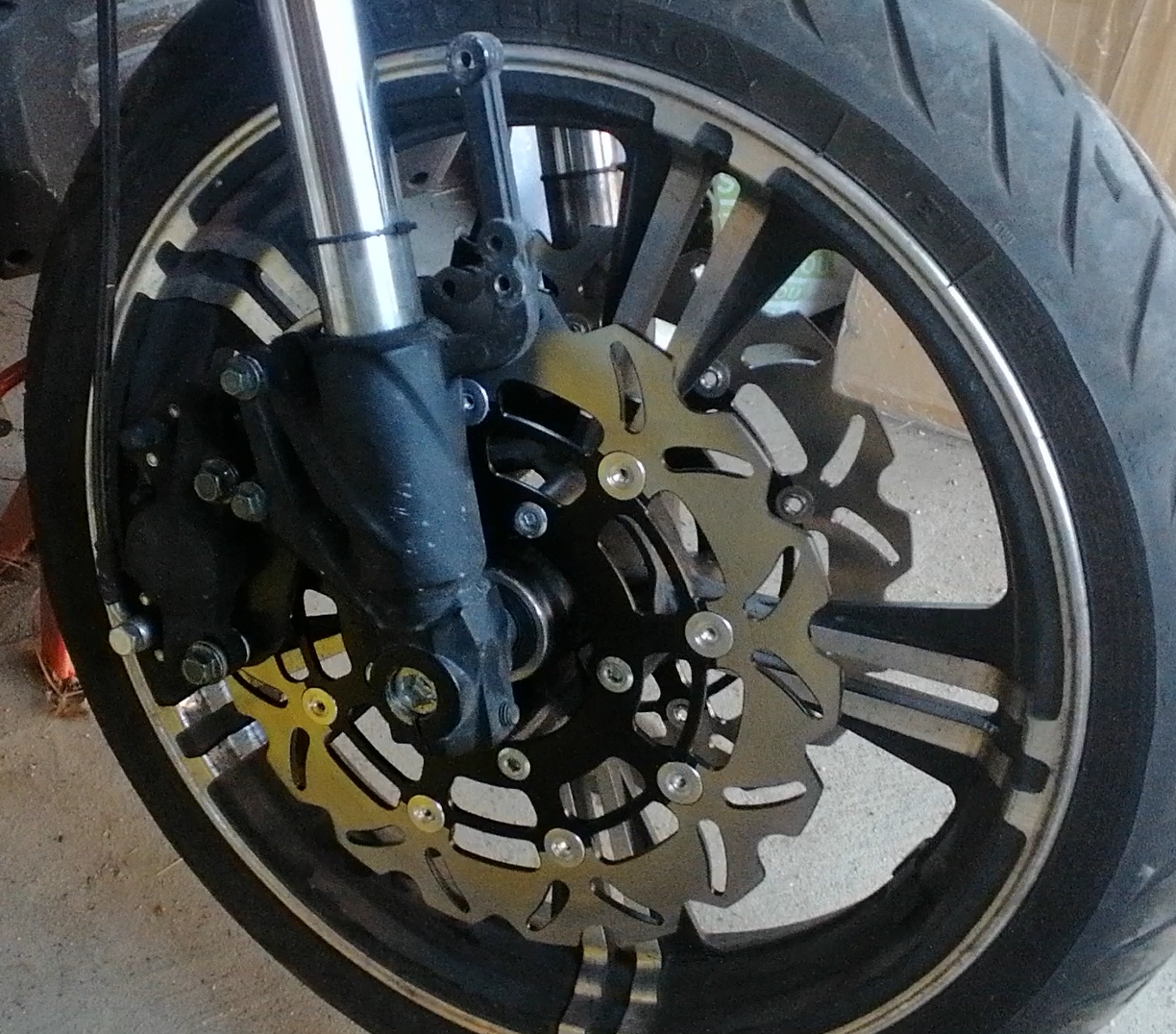 Muhehehe, finaly I replaced warped factory discs with new (floating) brake discs. I know, I did not mounted them symmetrically "wave to wave", I noticed it later and I like it more this way.