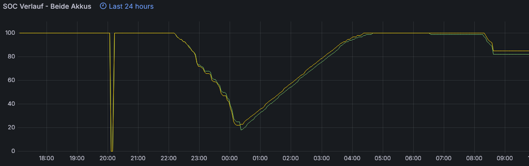 Bei mir ists interessant einer der Akkus der GT EVO reportet seinen SOC Zustand extrem verzögert, dies ist nicht nur im Grafana so, sondern auch in der App. Wenn ich on Tour bin und unterwegs lade, schaue ich eben oft nach wann es nun weiter gehen kann.