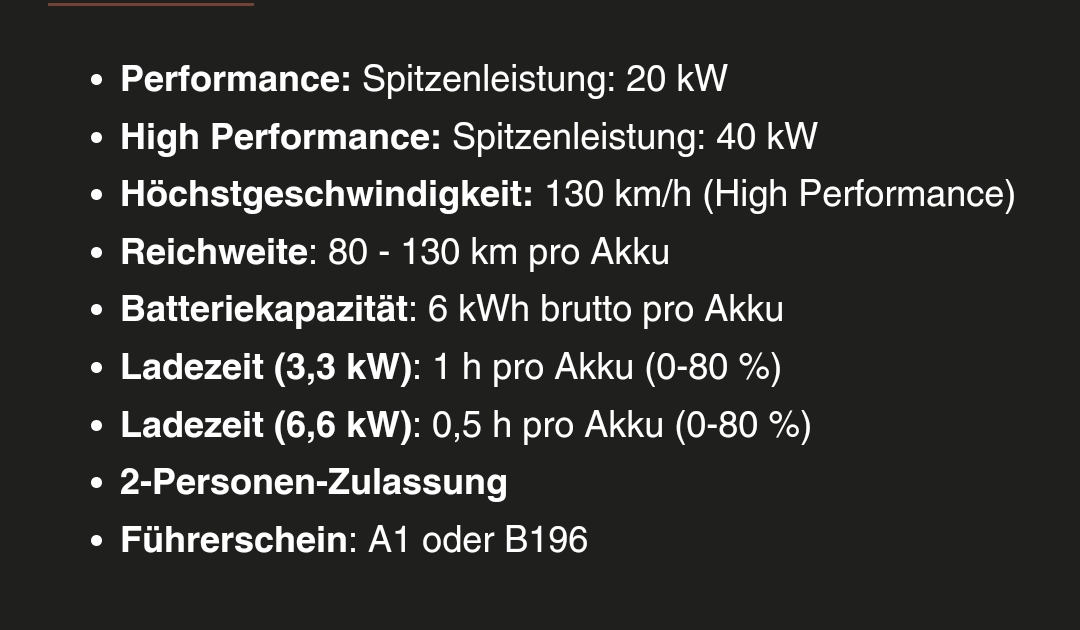 Jetzt wird's aber abstrus. Jetzt stehen auf der Webseite die Leistungsangaben wieder in kW. Diesmal allerdings ohne Angabe der Nennleistung. Es bleibt also spannendgreifswald hat geschrieben: Mi 31. Jul 2024, 16:06 Komischerweise sind die Leistungsangaben jetzt in PS und nicht in kw. Das war beim Verbrenner schon blöd, beim E-Moped allerdings noch irritierender.