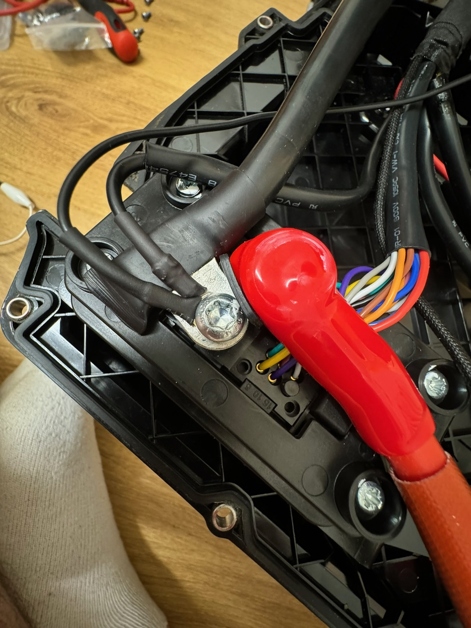In die Zuleitung wird noch eine 1-A-Sicherung eingebaut und diese mit Lötöse mit unter den Dauerplus am Albright-Schütz geklemmt, das Eingangsminus in ähnlicher Weise direkt am Hochstromkontakt des Multiconnectors. So angeschlossen liefert der Wandler im Leerlauf 12,3 V (laut hier nicht gezeigtem Foto). Das 12VUI-Kabel vom Multiconnector zum BMS wurde getrennt und mit dem (+)Ausgang des Wandlers verbunden, der (-)Ausgang ist intern mit dem Eingang verbunden und kann einfach frei bleiben (isoliert natürlich!)