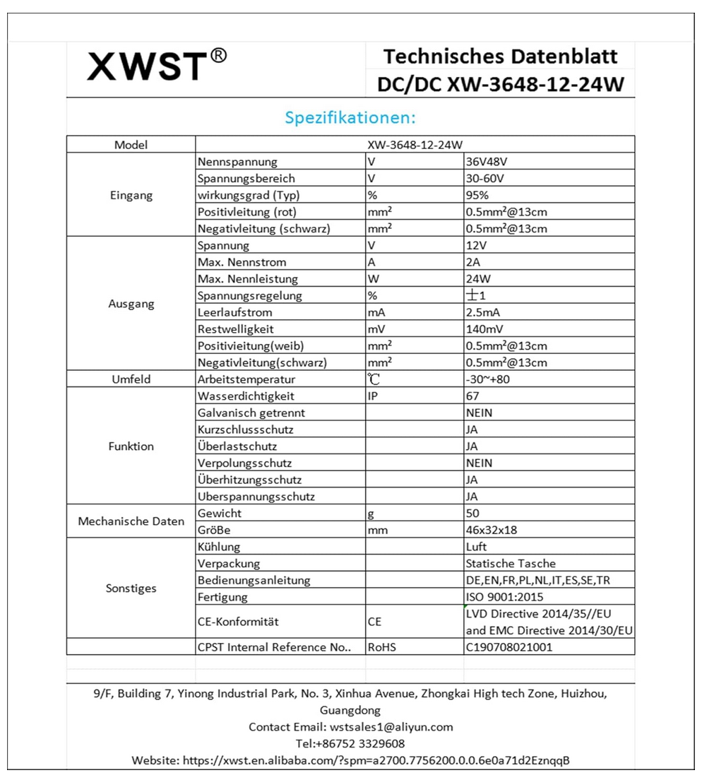 Verwendet wird ein 1A-Wandler "XW 3638 12-12W-S" (Link zu Amazon, aber nicht nach D lieferbar, aber