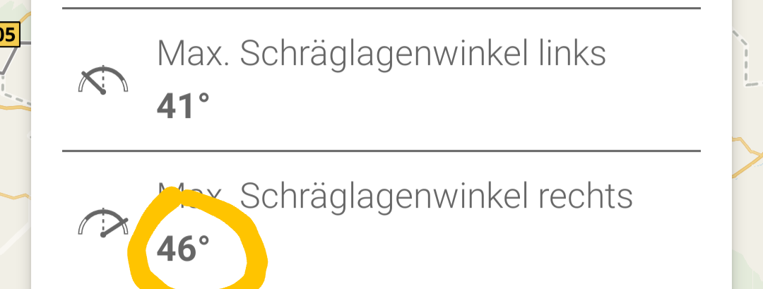Diese Zahlen sind i.W. Quatsch. Da spielen vermutlich andere fahrdynamische Faktoren hinein und verfälschen die Schräglagewerte. Bin definitiv keine 46° Schräglage gefahren, und bezweifle, dass das phys..möglich ware.