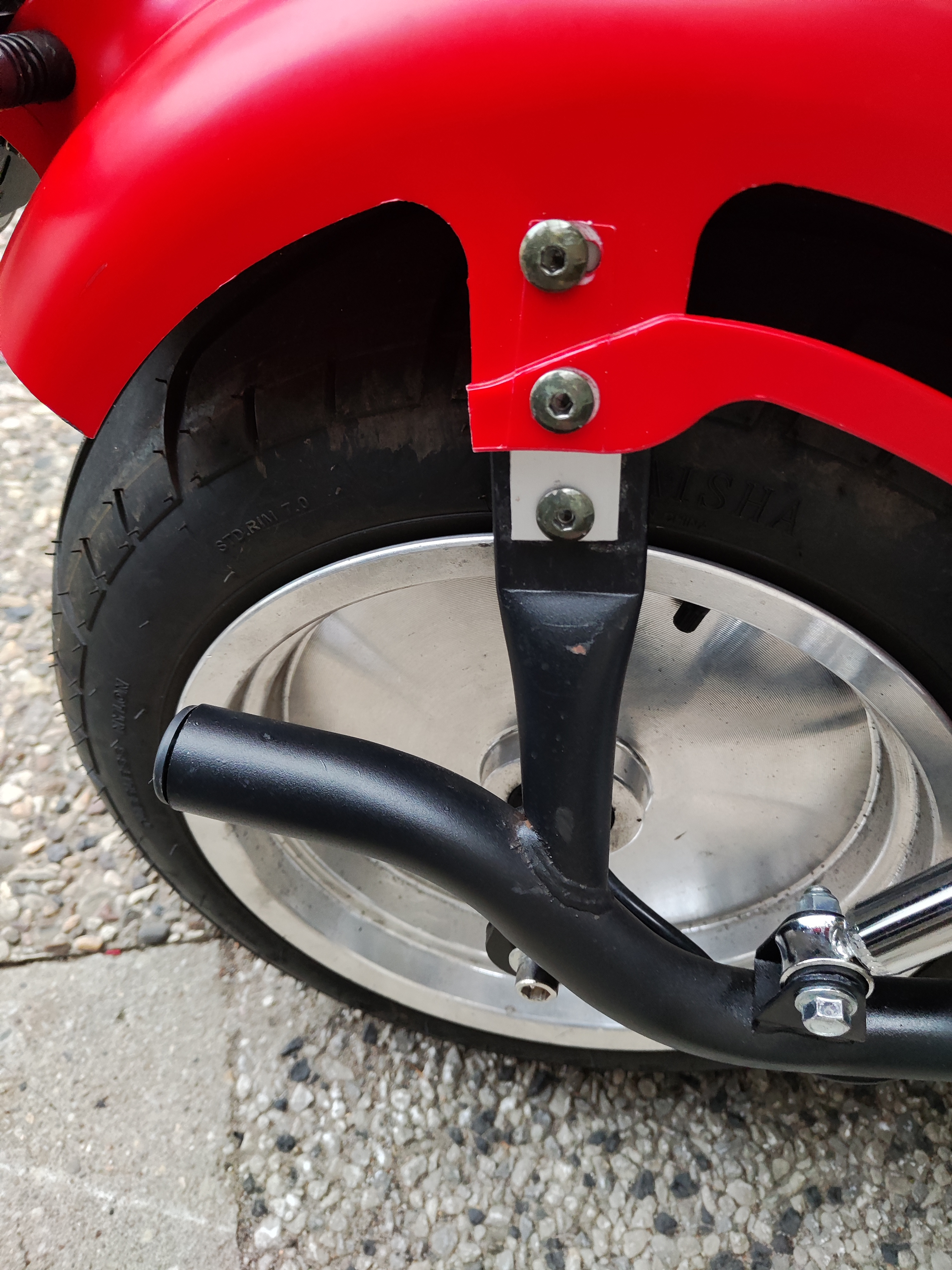 Weiter zum Thema: Eines von den Ästen hatte sich bei einer Tour in den minimalen Platz der Reifenlauffläche und dem inneren des Kotflügels verfangen und das Kabel erwischt, daran rumgezerrt, was ich nicht bemerkt habe. Letztendlich hat es dafür gesorgt, weil auch keine Sicherung im 12V Bereich vorhanden ist, dass es zu einem derben Kurzschlusse in der Heckleitung gekommen ist, demzufolge im Kabelbaum ein Kabelbrand entstand. Die verbaute Sicherung von 20A hat es nicht gejuckt. Ich hatte noch Glück im Unglück das letztendlich die CP-6 plötzlich maustot war und ich sie nicht in die Garage, sondern im Hof habe stehen lassen, sie hätte ja noch anfangen können zu brennen, bei den verbauten LiPo Akku wäre es möglich. Den Rest der Geschichte dürfte bekannt sein, es folgte knappe zwei Wochen erneuern der ganzen Elektrik. Ich rate alle die eine CP-6 haben den zu enganliegenden Kotflügel etwas anzuheben um nicht das selbe Schicksal zu erleiden wie es mir ergangen ist. Nachdem meine CP-6 wieder fahrtüchtig ist, habe ich heute mein Kotflügel mit wenigen Mitteln angehoben. Ein 7cm x 3cm Aluminiumstreifen mit 3 Bohrungen versehen, die unteren Beiden d=6,5mm und das obere mit 5mm und ein Gewinde M6 eingeschnitten. Der Rest versteht sich von alleine. Wenn das Wetter wieder besser ist kommt noch schwarze Farbe drauf.