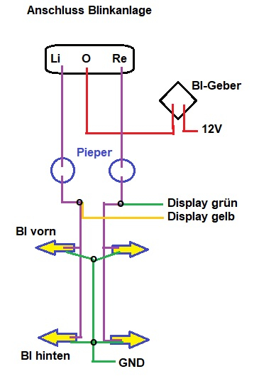 Demnach - falls nicht schon durchgeführt – 1 Pieper (Summer) in die Leitung 12V+ Richtung Blinkschieber am Lenker, oder 2 Pieper jeweils einen an die Leitung Schieber zu den Lauflichtern.