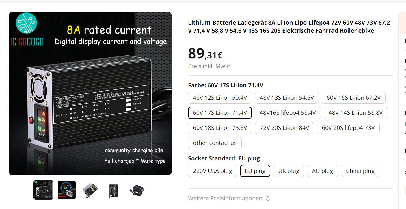 Aktuell benutze ich einen 71,4V 4A Lader aber mir dauert das vollständige laden der Akkus eindeutig zulange und ich suche nach einer Alternative, hierbei bin ich über den 69,7V 10A Lader
