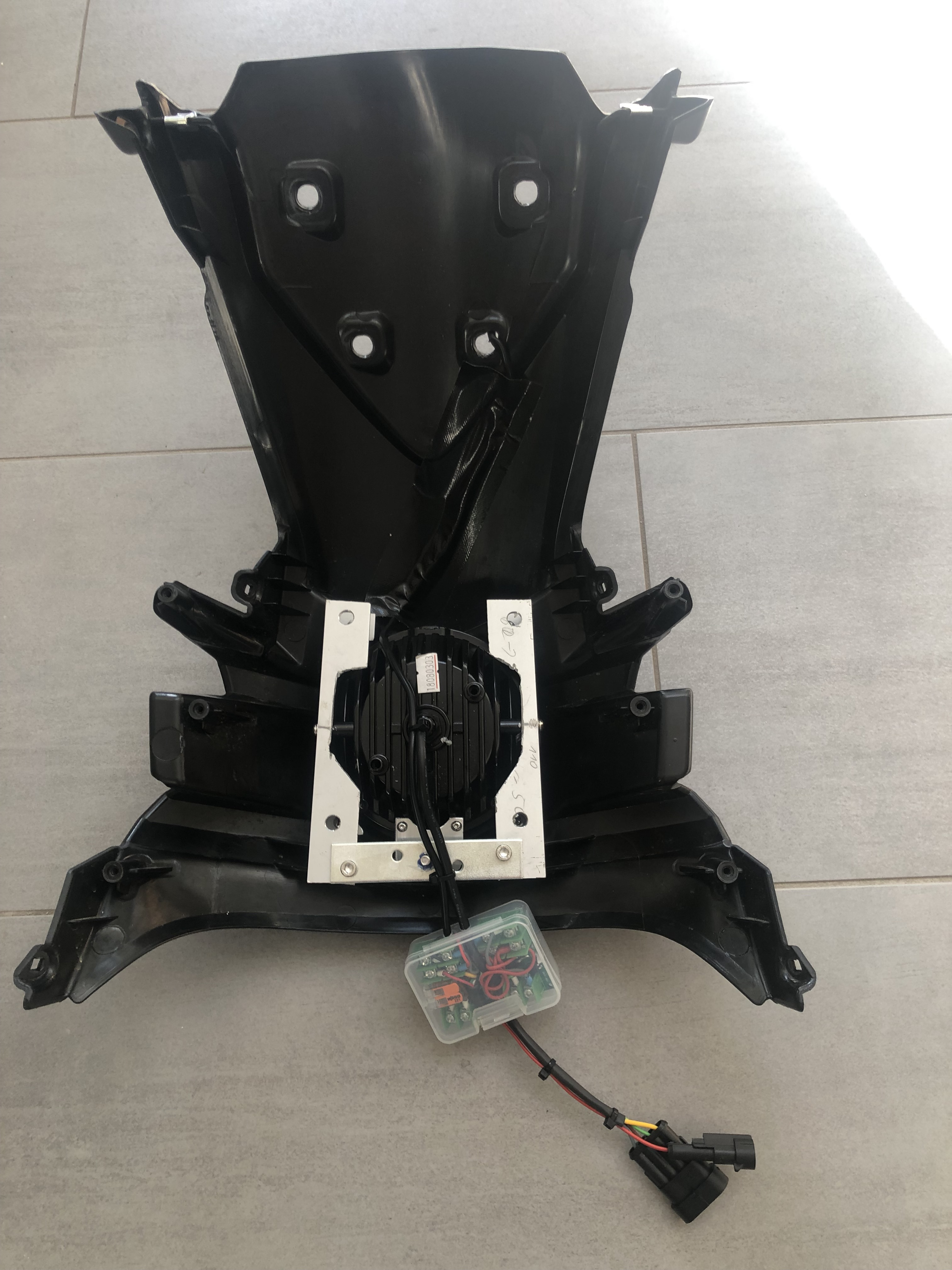 Hier die angefertigte Lasche (Mitte unten): Dann der Verstellmechanismus mit einer Imbusschraube. Die Muttern sind inzwischen gekontert und verklebt: Vom Orginalstecker zum Adapterstecker mit dem alten Scheinwerfer: Fertig angeschlossen: Und im eingebauten Zustand (der Lichtreflex kommt vom Handyblitz): Den Plus für den Scheinwerfer habe ich von der USB-Buchse genommen und die Sicherung von 1A auf 2A erhöht.