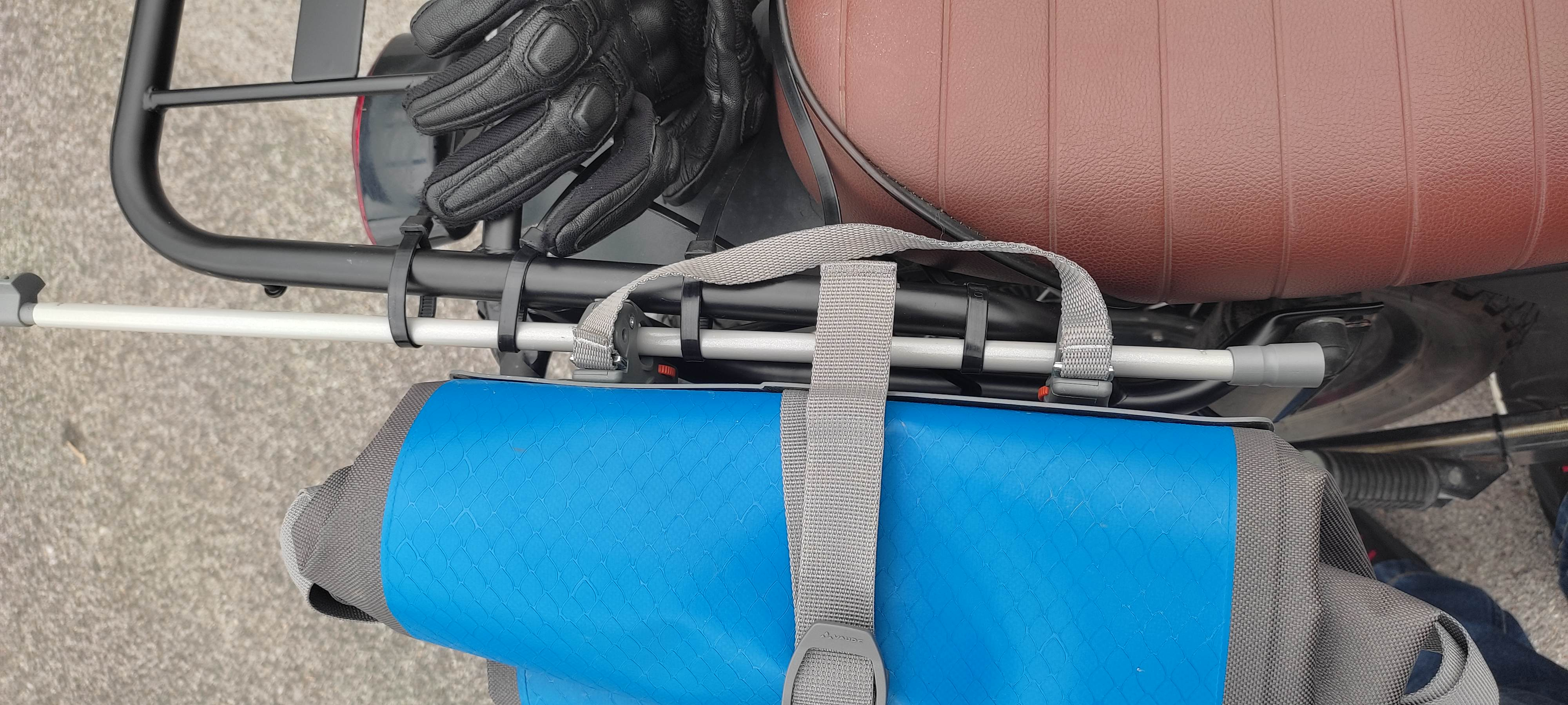 Sollte es für Vaude keine passenden Haken geben, werde ich versuchen eine dünnere Strebe an den Gepräckträger anzuschrauben.