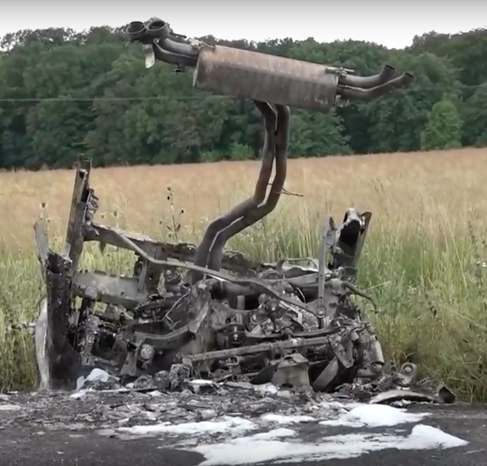 Ich wäre eher für die Benzintheorie, und der Brand hat auf die Batterie übergegriffen. Dafür spricht auch, dass der Wagen auf dem Dach lag, aber hinten tatsächlich alles weg ist: Benzin ist rausgelaufen und hat vom unten liegenden Dach aus für Chaos gesorgt, das mit der Schippe aufgelesen werde mußte.