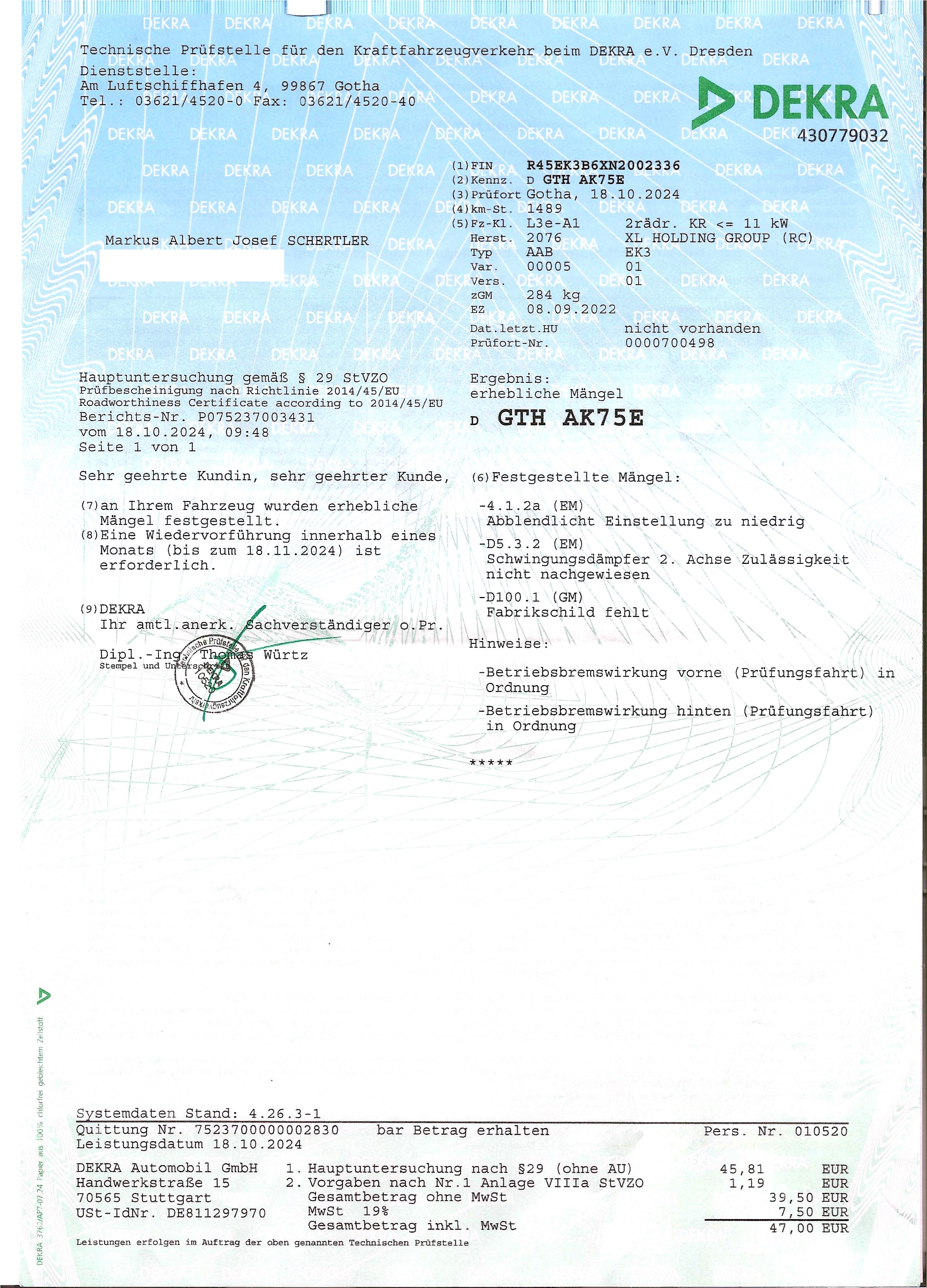 Es wurde ein Prüfgerät für den Scheinwerfer verwendet Was meinst du mit Last geprüft? Aus dem Stegreif wusste ich nicht wie der Scheinwerfer einzustellen ist.DBuegel hat geschrieben: Fr 18. Okt 2024, 14:44 Wie soll ein zu niedriges Abblendlicht ein EM sein? Das sind doch nur paar Handgriffe, den Scheinwerfer etwas höher zu stellen.Wurde ein Scheinwerfereinstellgerät verwendet oder persönliche Einschätzung des Prüfers? Und wurde mit Last geprüft?