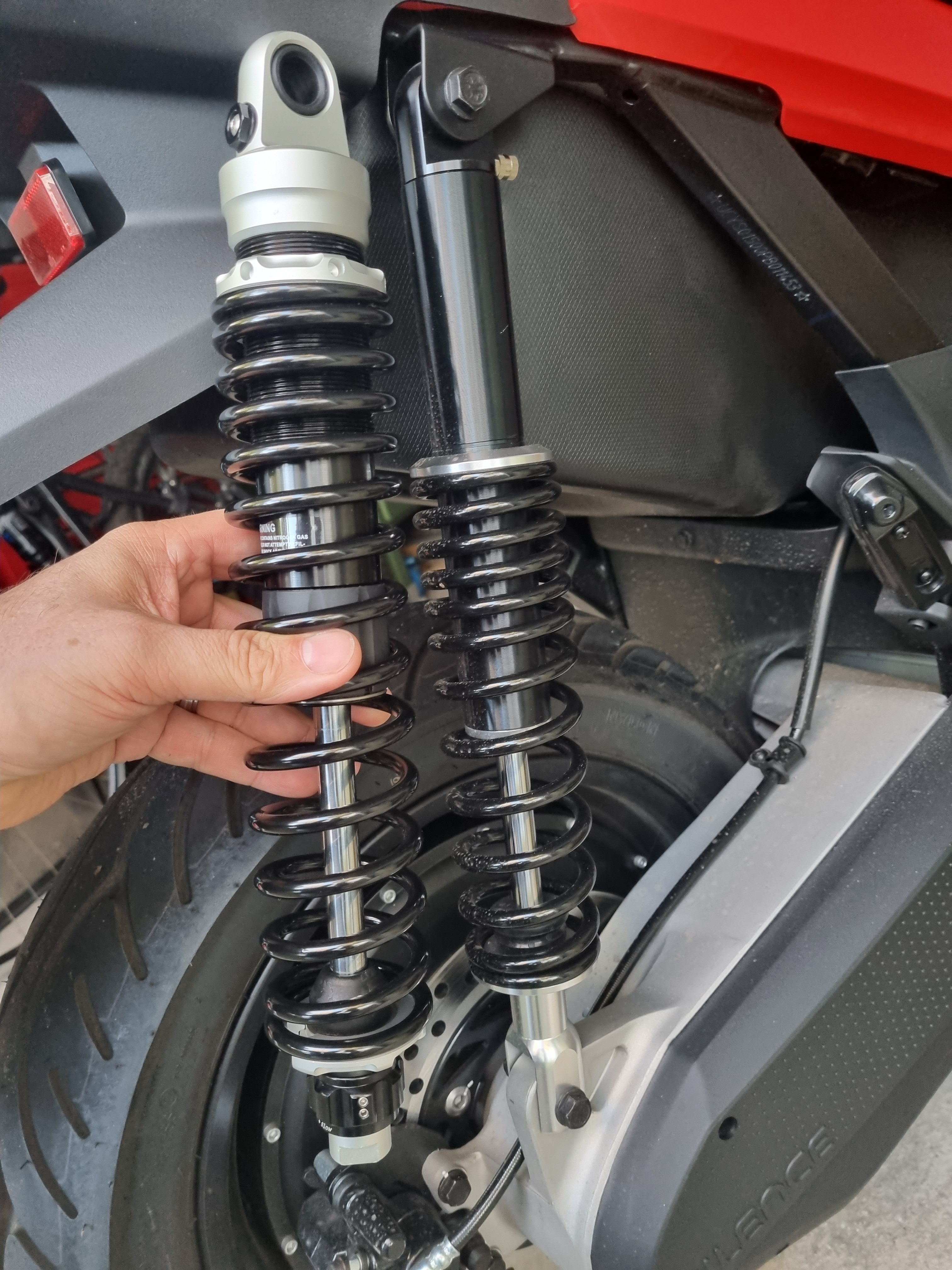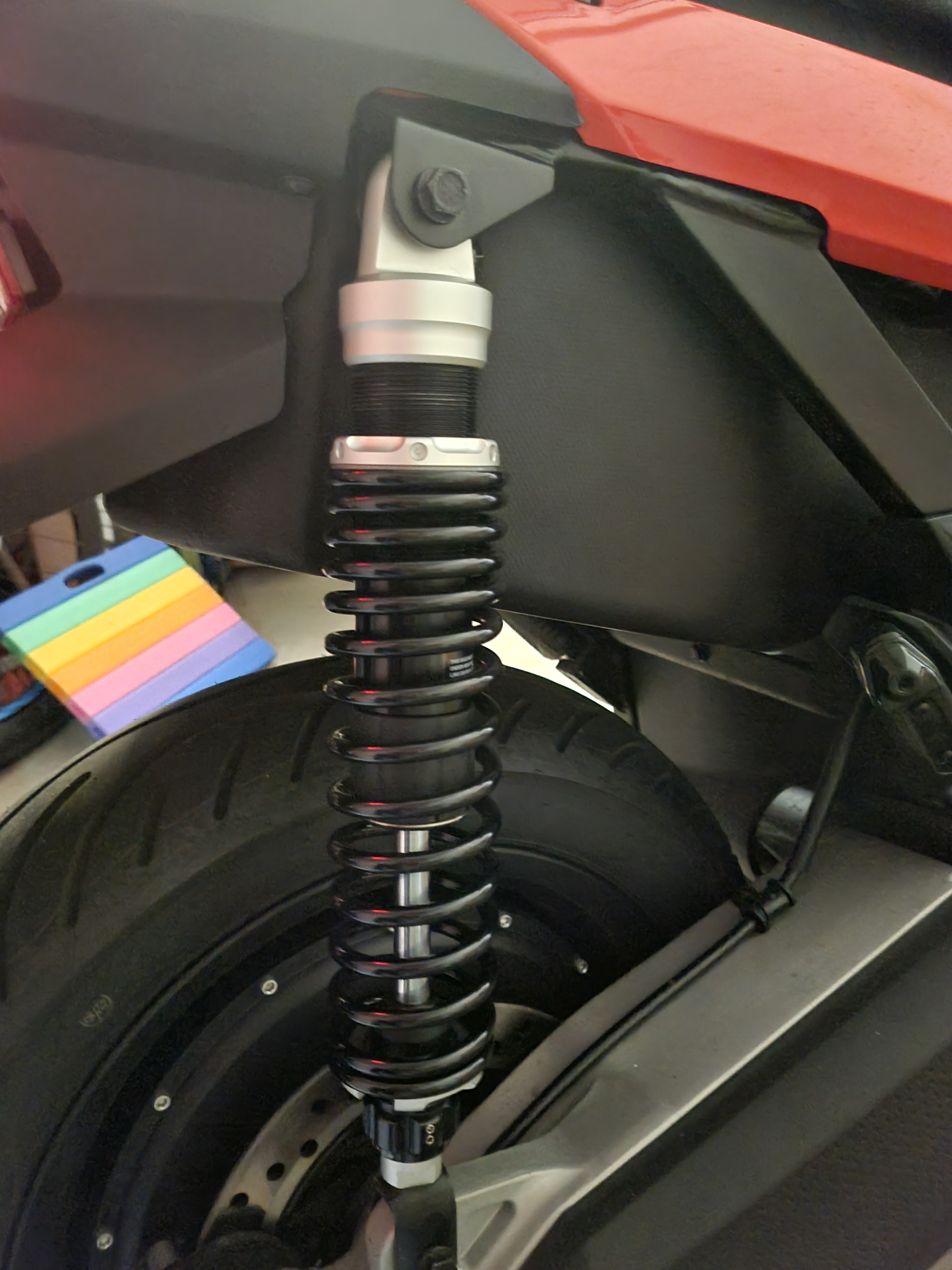 Bisher hatte ich die Gabel modifiziert https://www.elektroroller-forum.de/view ... 99#p213899 und mit dünnerem Öl experimentiert. Dabei hatte ich die Menge auch testweise bis 160 Milliliter gesteigert und natürlich auch parallel verschiedene Reifendrücke probiert.