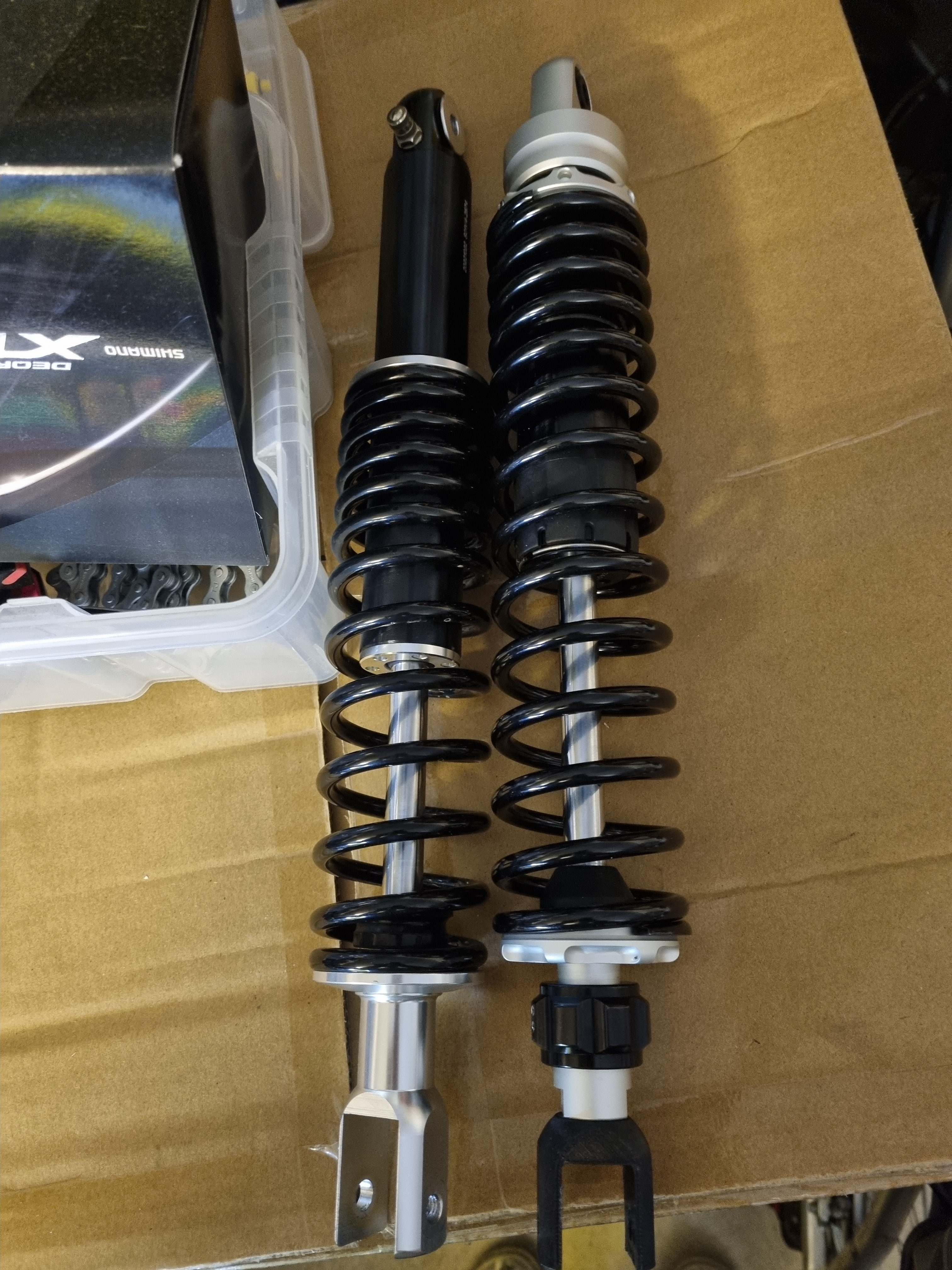 Der Dämpfer für hinten ist auch angekommen. Jetzt müssen noch neue Buchsen gedreht und das U auf der anderen Seite gefräst werden.