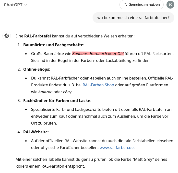 Gute Sache! - Aber für den einmaligen Gebrauch einfach nicht rentabel.Evolution hat geschrieben: So 27. Okt 2024, 13:46 Wenn dein Auge den richtigen Farbton nicht erkennen kann, gibt es auch technische Hilfsmittel wie ein Farberkennungsscanner: