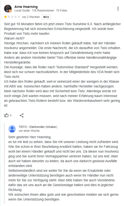 ich habe inzwischen einige tisto roller fahrer hier kennengelernt, auch indirekt familie, die abneigung zu dem produkt hier im ort ist kein geheimniss bei den geschädigten.