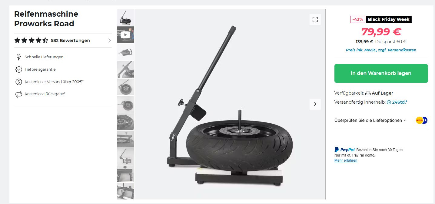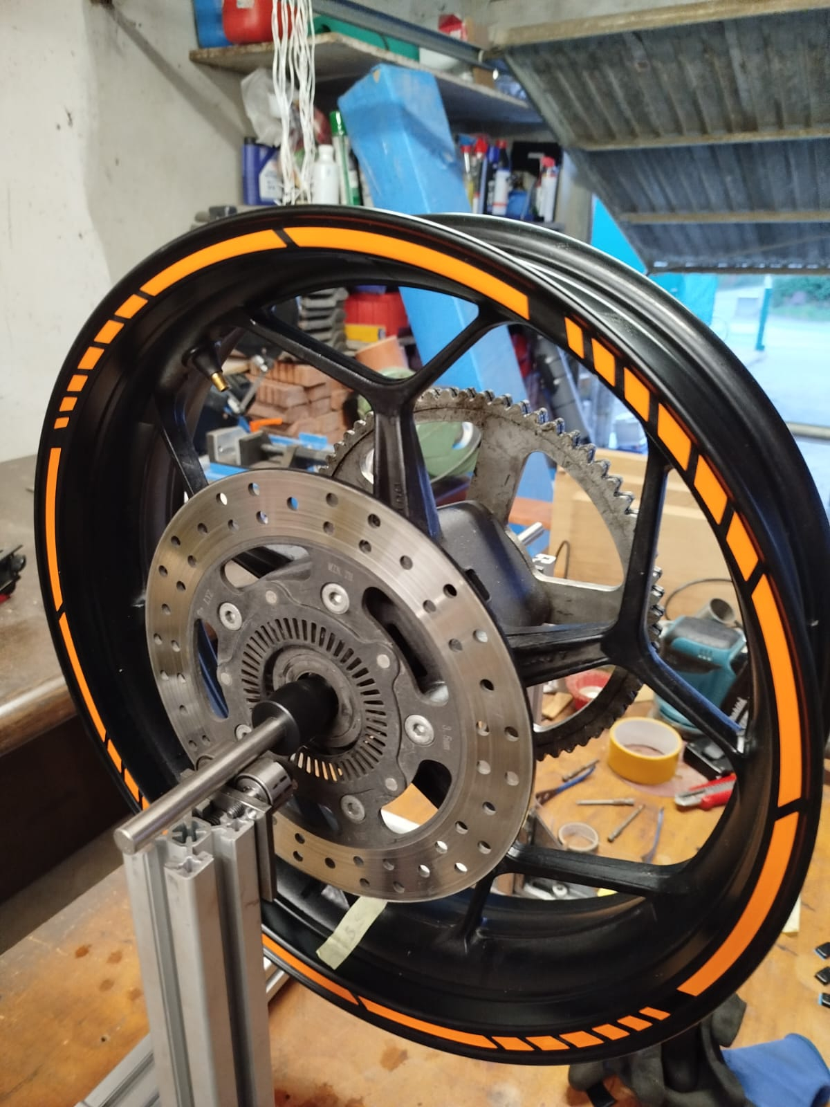 Mit der Montagevorrichtung von 24mx.de https://www.24mx.de/product/reifenmasch ... d-PW-GTM-B hat das echt sehr gut funktioniert (ich musste nur die Zentrierwelle von 18mm auf 16mm abdrehen, da wir eine Welle von 17mm haben). Nach der Demontage des alten Reifens an der hinteren Felge, habe ich erstmal geschaut ob die Unwucht hat und wo diese ist. Ich musste 55g an die Felge provisorisch ankleben um das Ungleichgewicht auszugleichen.