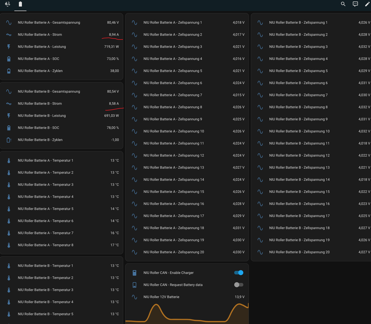 Habe den BatteryChecker um WiFi und MQTT Funktionalität erweitert und habe nun die Batteriedaten beider Akkus ins Homeassistent integriert. WiFi im Hof geht gerade noch so.
