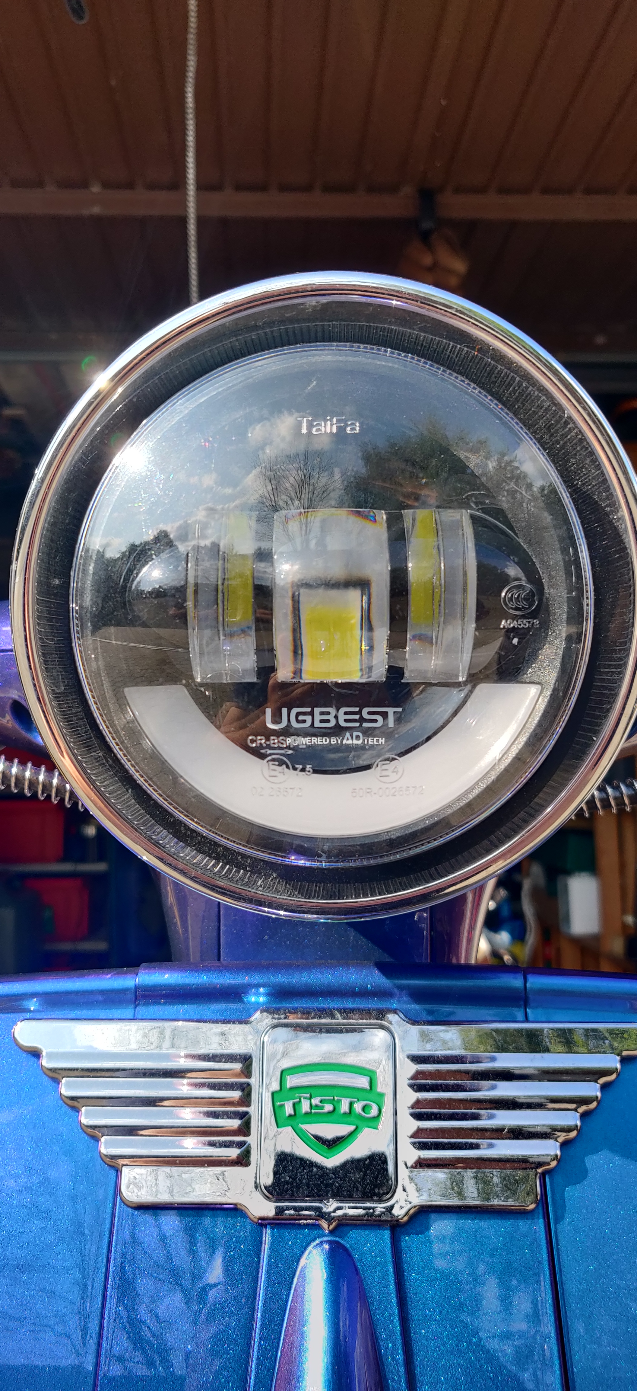 Tacho wieder drin, kleine Schrecksekunde, das grüne Licht kommt nicht und der Gasgriff reagierte nicht, alles nochmal gelöst und wieder zusammen, nun geht alles wieder. Vielleicht ist das auch mein sporadischer Ausfall, der Stecker, die Pins und beide Kabel werde ich wohl noch mal genau unter Augenschein nehmen. Bei der Gelegenheit gleich mal den Scheinwerfer LED vom Nova schnell mechanisch montiert, das sieht ganz gut aus.