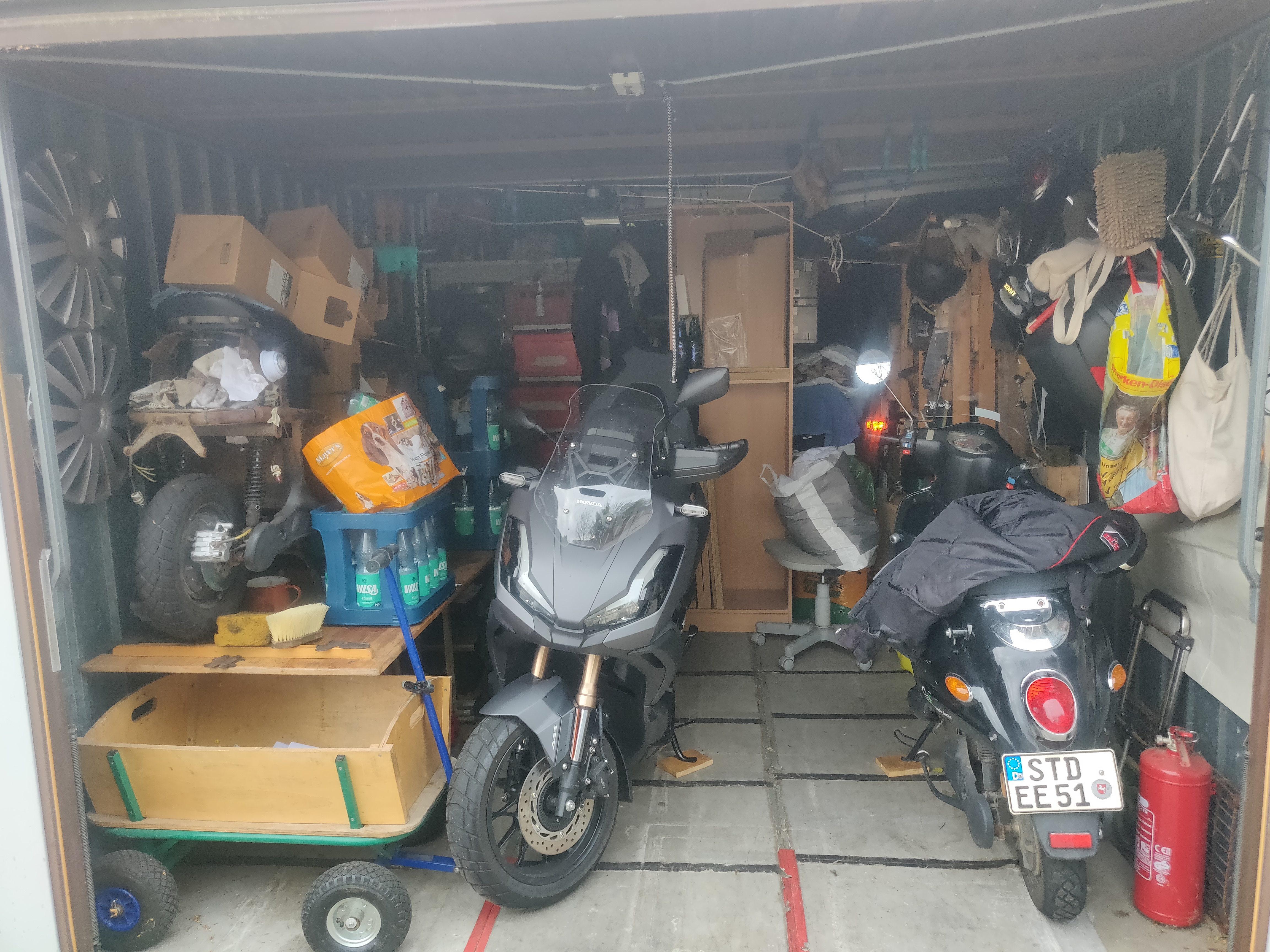 Gestern Abend war starker Wind und als ich vom Balkon aus zum Parkplatz sah standen die Container auf dem Parkplatz verteilt. Sie wurden durch den starken Wind bewegt. Dabei hatte ein Container den Roller vom Hauptständer gestoßen und umgeworfen. Durch die Abdeckplane und dadurch das er in die Hecke fiel war nichts weiter passiert.