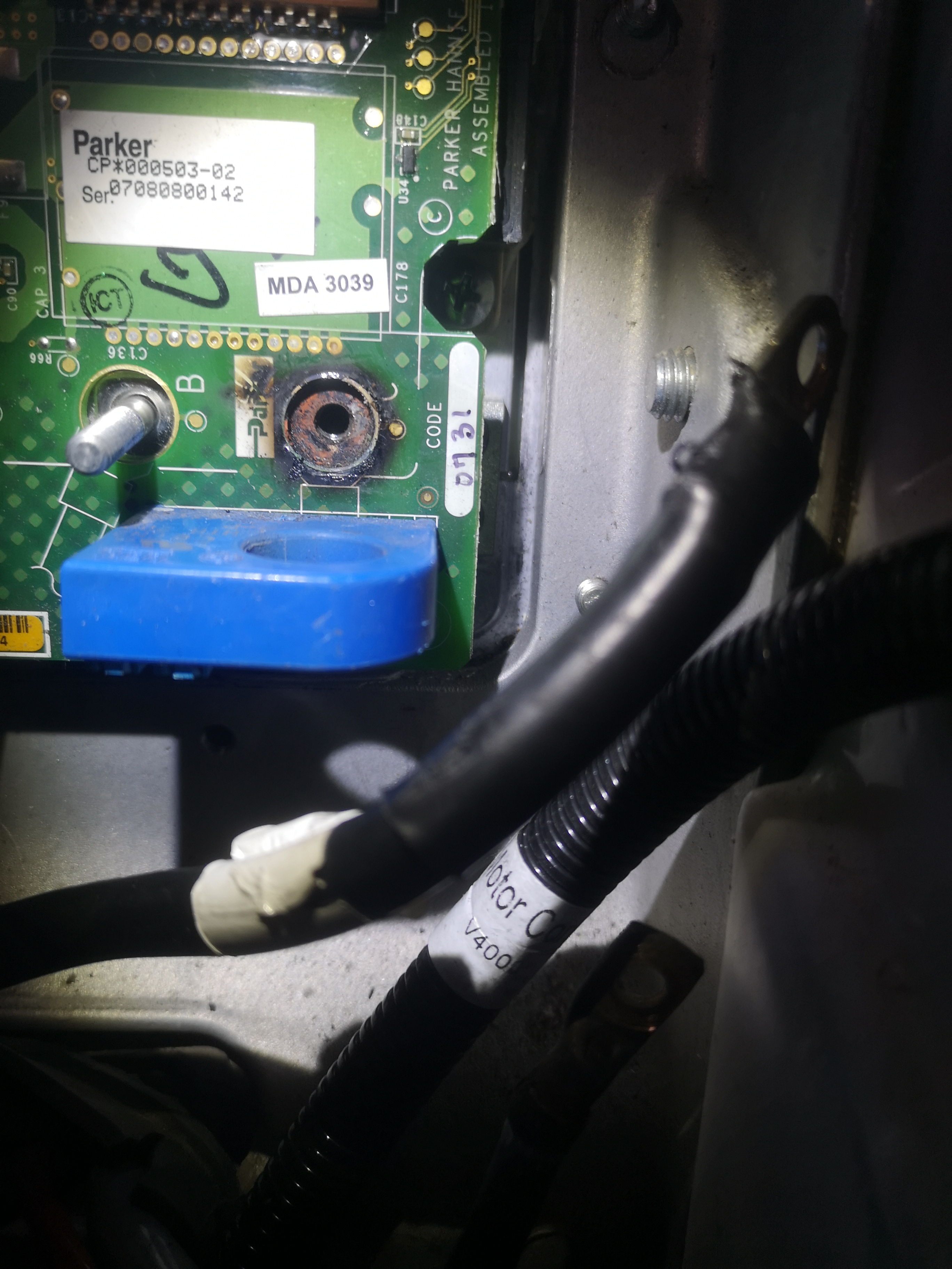 Die Terminals, an denen die Batterie- und Motorphasenkabel angeschlossen sind, haben wohl oft Probleme in der VX-1 gemacht. In meiner Vectrix ist bereits ein verbessertes Modell eingebaut. Trotzdem ist ein Phasenanschluss komplett verschmort. Der Stehbolzen, auf den ein Rundstück aus Messing aufgeschoben ist, wurde bereits gewaltsam mit einer Zange behandelt. Vielleicht war der mal lose. Jedenfalls hat man das Problem nicht gelöst, sodass das Terminal extrem heiß geworden ist. Die Litze des Kabels ist bestimmt 10 cm weit verglüht.