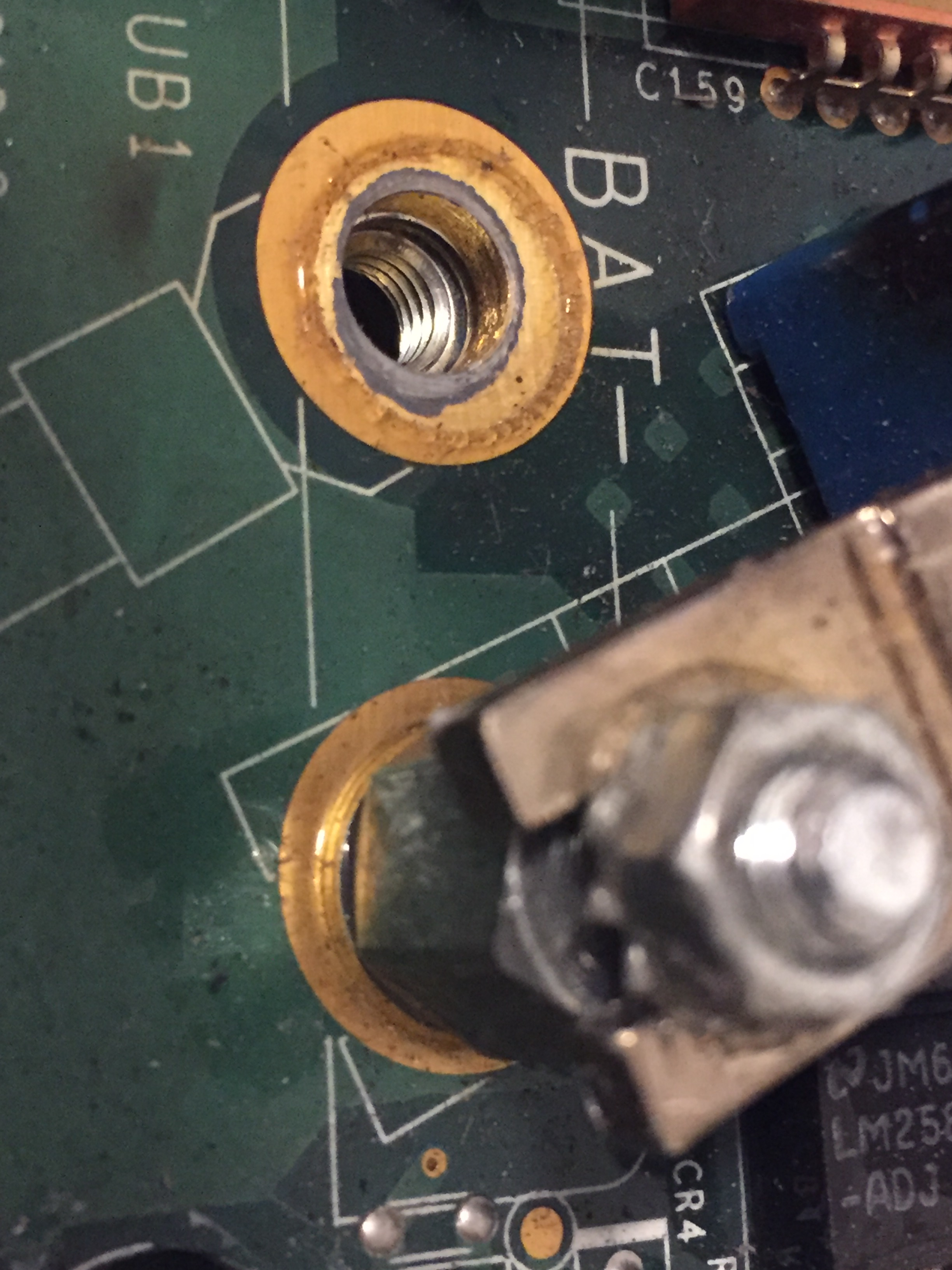 Ein größeres Problem stellen meiner Meinung nach die VBat Terminals dar. Die sitzen auf einer Kontaktfläche zur Platine. Hier hat Vectrix gepatzt und eine andere Lösung gewählt: Sechskant mit beiseitigem Gewinde. Ausserdem sind 2 völlig überflüssige Unterlegscheiben verbaut. Beim Beschleunigen haben einige Vectrixer 200A gemessen. Meine Zellen könnten sogar das doppelte liefern.