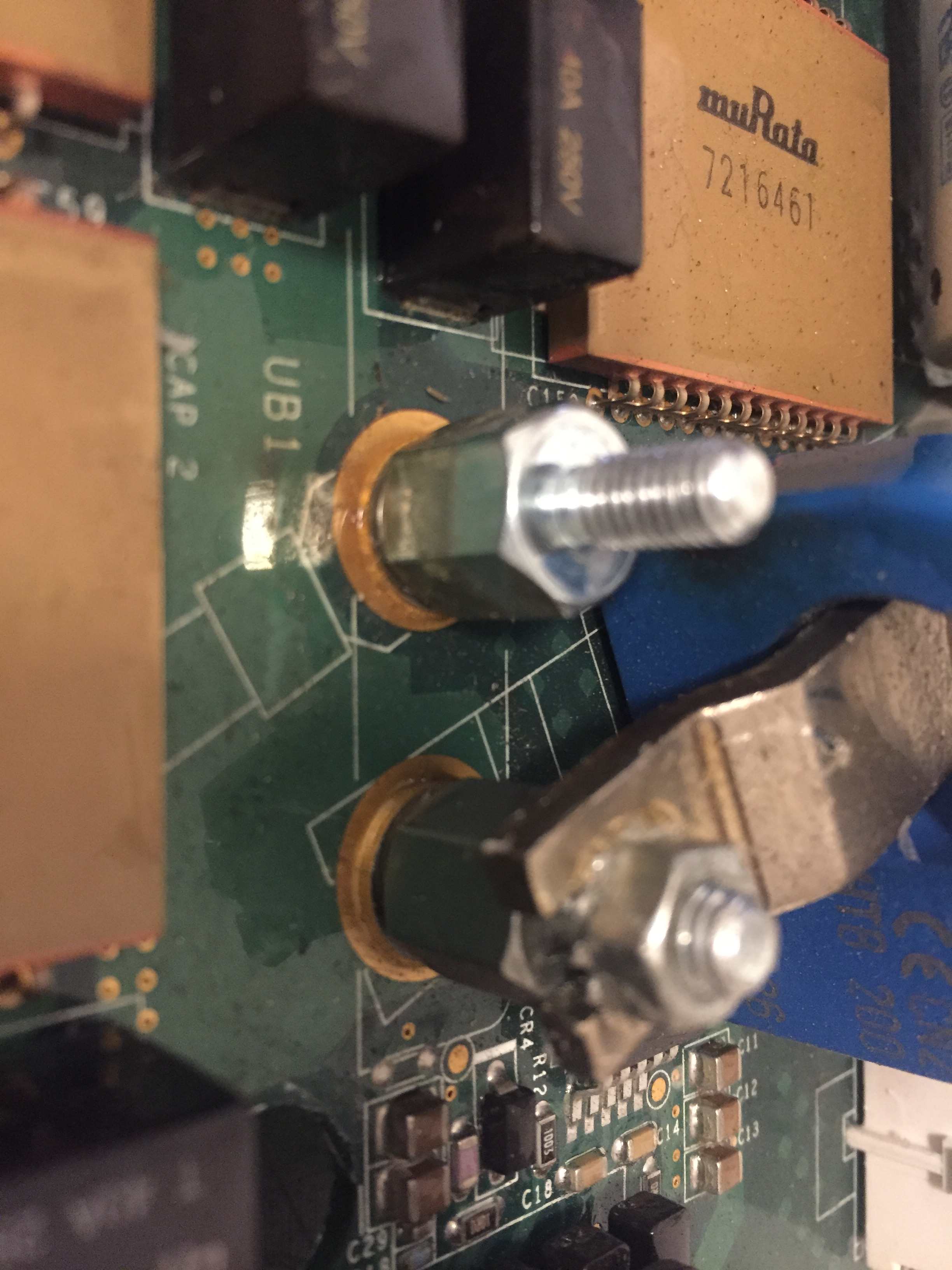 Man sieht, dass die Kontaktfläche nicht ausgenutzt wird/wurde und zusätzlich noch der Schutzlack unter die Verschraubung gekrochen ist. Im Prinzip dürfte gegenwärtig nur die M5 Verschraubung den Strom leiten. Hier hat Vectrix richtig gepatzt. Auch an diesen Terminals ist der Gegenpart das IGBT-Modul auf der Unterseite der Platine. Die Öse in der Platine ist für die Versorgung des 150W DC Converters gedacht. Der zieht aber bei 150V auf der Eingangsseite nur 1A. Gut gedacht ist halt nicht immer gut gemacht.