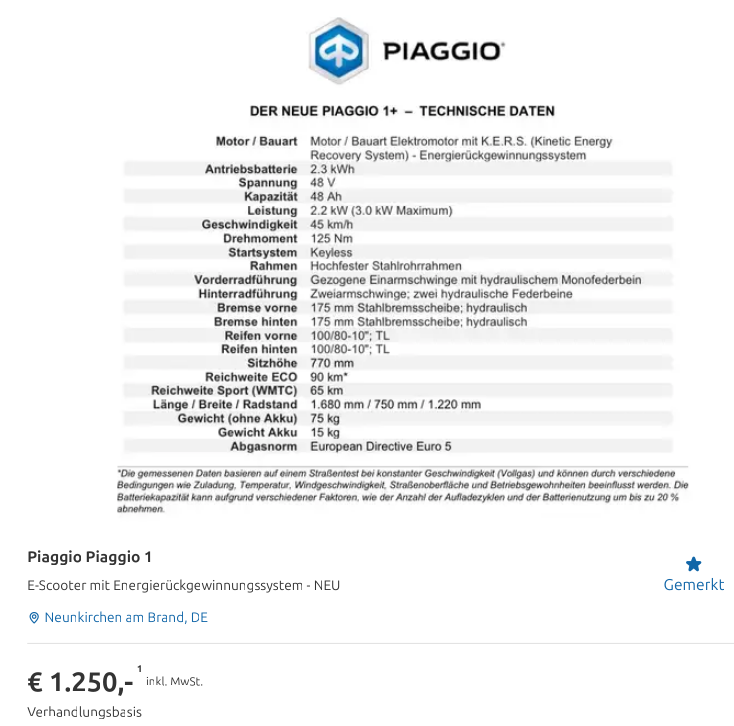 Komplizierte Geschichte.... Es gab dann zwischenzeitlich ein besseres Angebot, nämlich einen Piaggio 1+ ("Eins Plus"), der für 1.250 € VHB angeboten wurde, in der Gegend. - Der war neu, aus einem Gewinnspiel gewonnen. Noch dazu mit größerem Akku (2,3 kWh). Im Geschäft kostet der mindestens 2.600 €.
