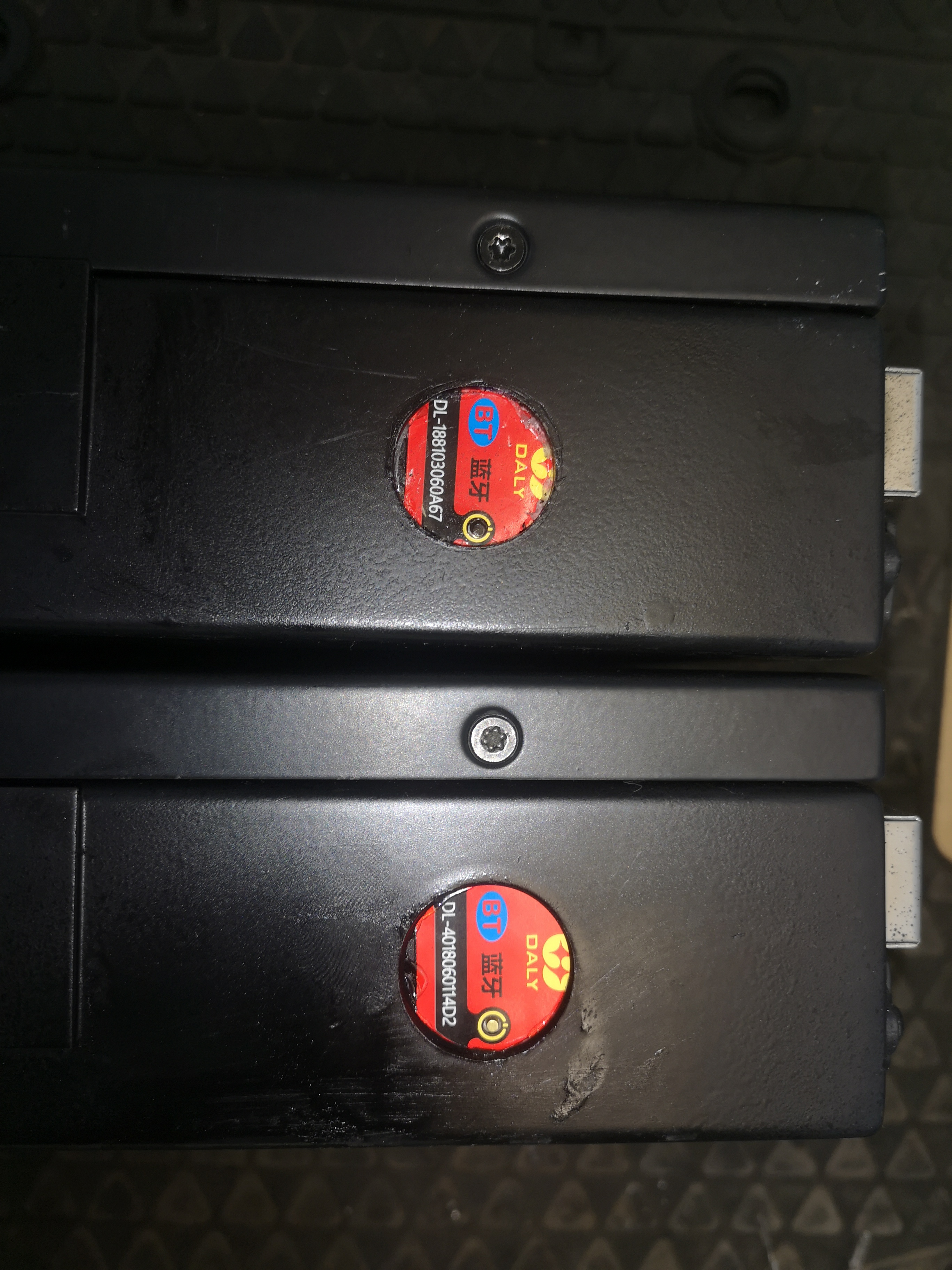 Allerdings war eine der beiden Batterien „eingefroren“. Sie ließ sich weder laden noch entladen. Daher habe ich sie aufgemacht und das BMS vom Akkustrom B+ und B- getrennt. Danach funktionierte er wieder. Dabei habe ich festgestellt, dass das BMS mit 20A nominaler Leistung angegeben war – eine kleine Platine, die nur durch eine dünne Isolation auf den Zellen klebt und bei Überhitzung durchaus Schaden anrichten kann. Nach einigem hin und her kam die Auskunft vom Hersteller, dass sie angeblich gar kein größeres BMS liefern können. Dabei war in der Tabelle ganz klar 50A angegeben. Das grenzt an gefährlichen Betrug. Ich bekam 50$ /Akku zurück und habe dafür Batteriemanagementsysteme 60A mit Bluetooth von Daly eingebaut. Sie passen oben quer grade so ins Gehäuse, weil die Anschlusskabel recht flexibel sind.
