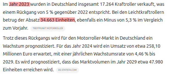 Ganz einfach: Da werden dann vielleicht auch viele, die bisher einen Verbrenner kauften, sich so einen E-Roller jetzt zulegen. Der E-Roller-Markt kann ja auch den Verbrenner-Rollermarkt (der wahrscheinlich 10 Mal so groß ist) "kannibalisieren". Somit schadet diese doch eher mickrige Zahl von 900 Billig-E-Rollern den etablierten Nischen-Elektroroller-Händlern wahrscheinlich gar nicht übermäßig.andreas7 hat geschrieben: Mo 27. Jan 2025, 19:15 Da passt was nicht. Mit 900 Stück bräuchte man dann runde 4 Jahre um alle zu verkaufen???