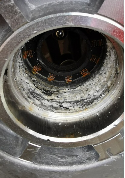 I think perhaps this motor has been open before, and that is why the bearing surface was the problem, it got bashed and not well sealed. This corrosion was why it was reluctant to move. Maybe this is useful information for people reinstalling their motors?