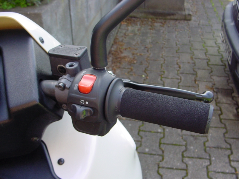 Vorn nur eine Einkolben-Scheibenbremse, aber Italienische EBR-Gabel: Die rechte Armatur: Der rote Kippschalter auf ON begrenzt die Höchstgeschwindigkeit auf um die 50km/h. Aber das habe ich nicht wirklich vor, auszuprobieren...