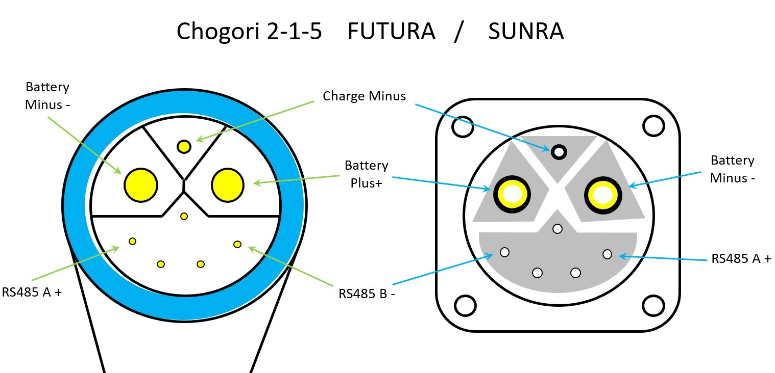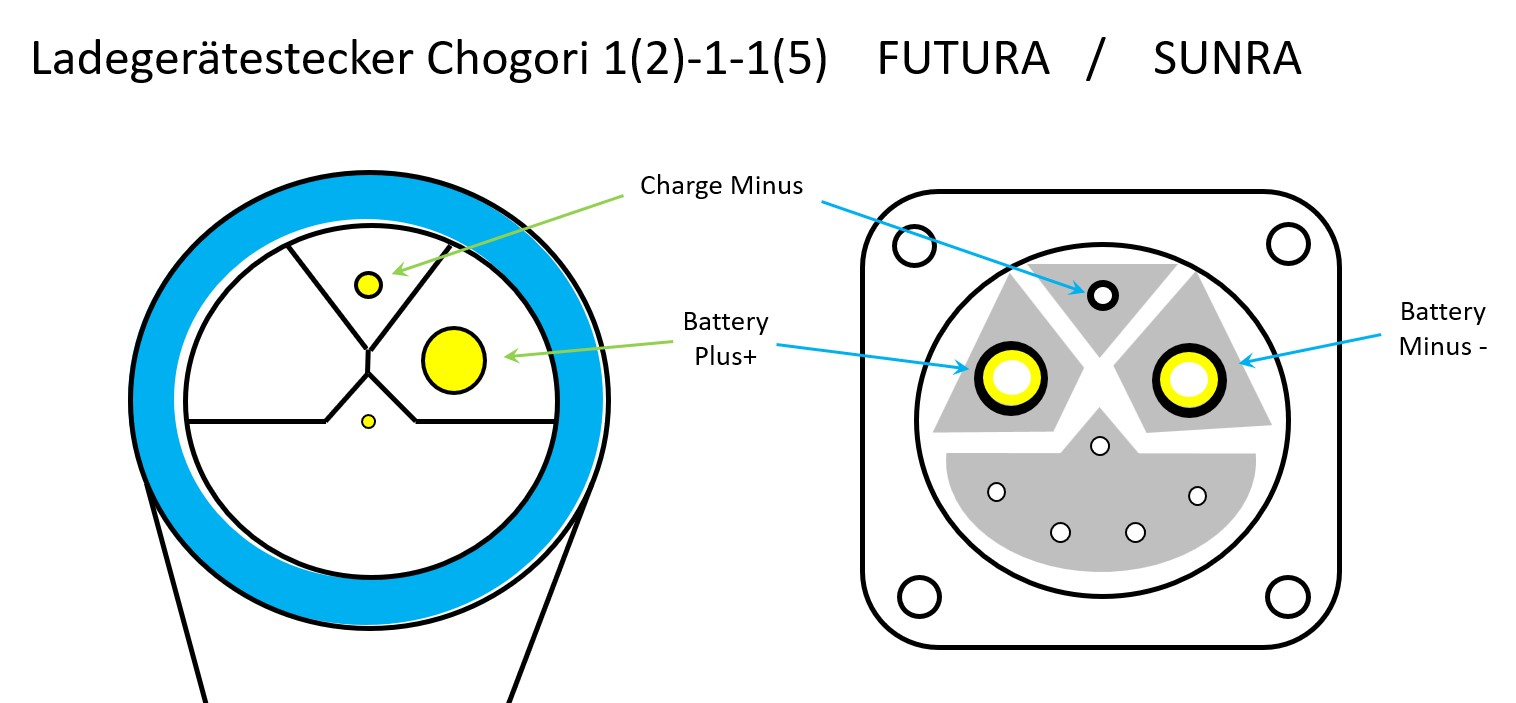 Geklärt sind diese Pins (allerdings von den 72Volt-Modellen): Wenn der dünne Pin genau in der Mitte jetzt kein Kabel dran hat, könnte das lose Kabel dahin gehören.