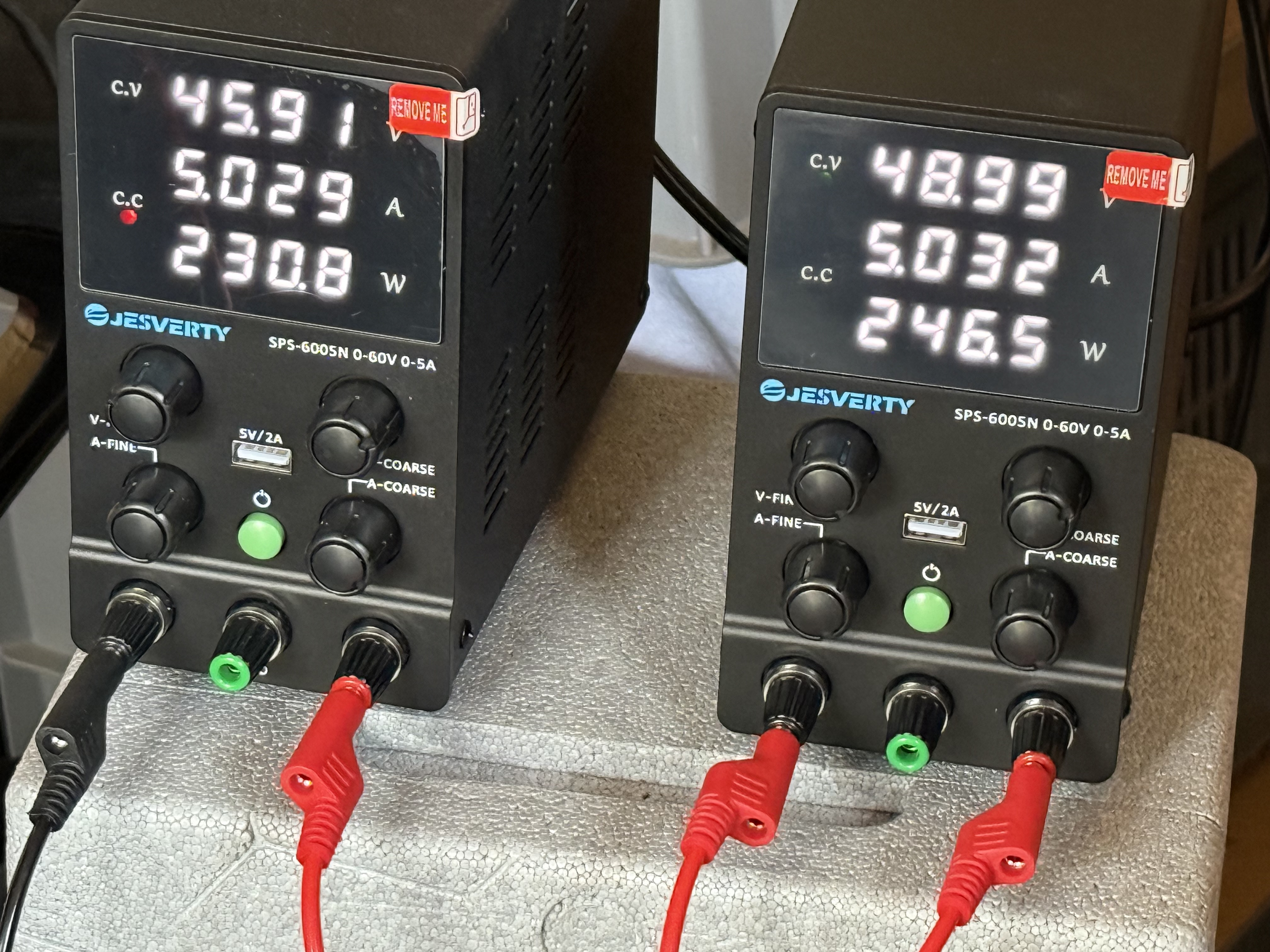 Ich weiß nicht, wie, aber die beiden 2s-Blöcke (mit je einem BMS und 12s9p) haben keine nennenswerte Drift untereinander. Hier lag (und liegt immer noch) meine größte Sorge, dass die Blöcke voneinander abdriften und ich sie manuell einzeln angleichen muss. Nun, das muss ich auf jeden Fall weiter beobachten! Ich kann nur vermuten, dass trotz nicht aktiviertem Bike die beiden BMSse sich untereinander unterhalten. Da meine Laborladegeräte erst CC und dann CV laden, geht der Strom ja nun gegen Ende auch wirklich in den Keller. Bei unter 75mA Ladestrom habe ich dann abgeklemmt.