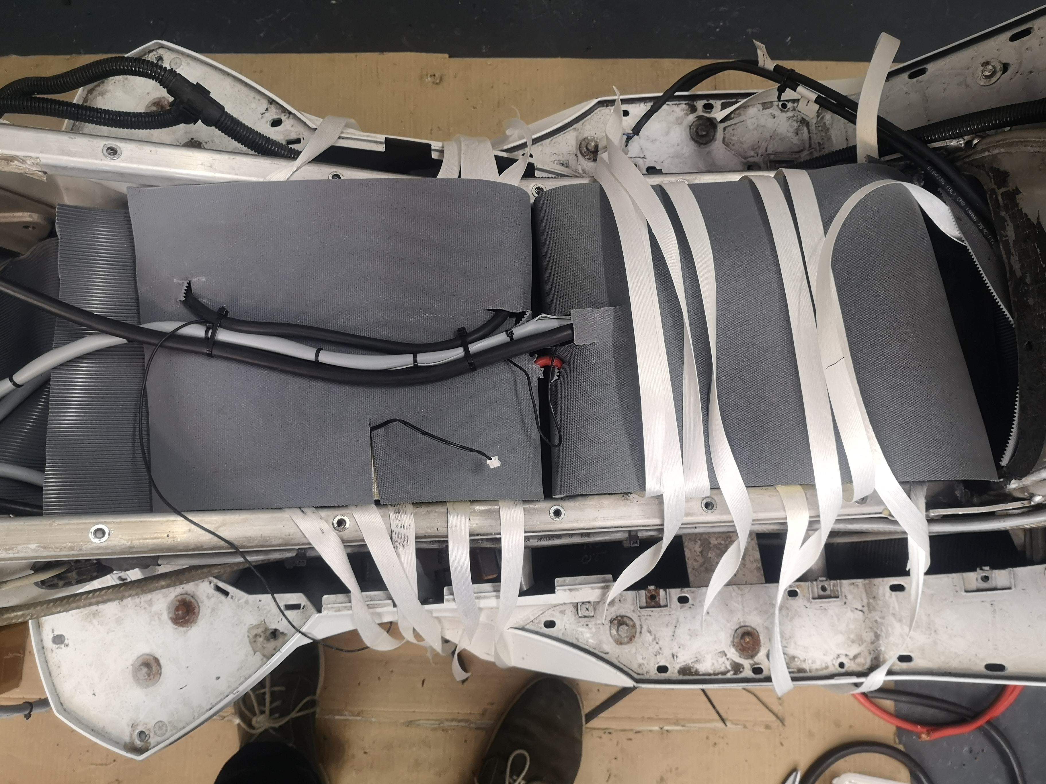 So, die ersten 1.000€ und gut 40kg sind verbaut. Die 175Ah-Zellen plus Isolator passen Millimeter-genau in das Akkufach, sodass ich auf ein zusätzliches Gehäuse verzichtet habe. Stabiler als der Vectrix-Rahmen wäre es sowieso nicht. Leider habe ich versäumt, Schlaufen unter einigen Zellen hindurch zu ziehen. Wenn die Zellen mal aufquellen, dürfte es mühselig werden, die wieder rauszuziehen.