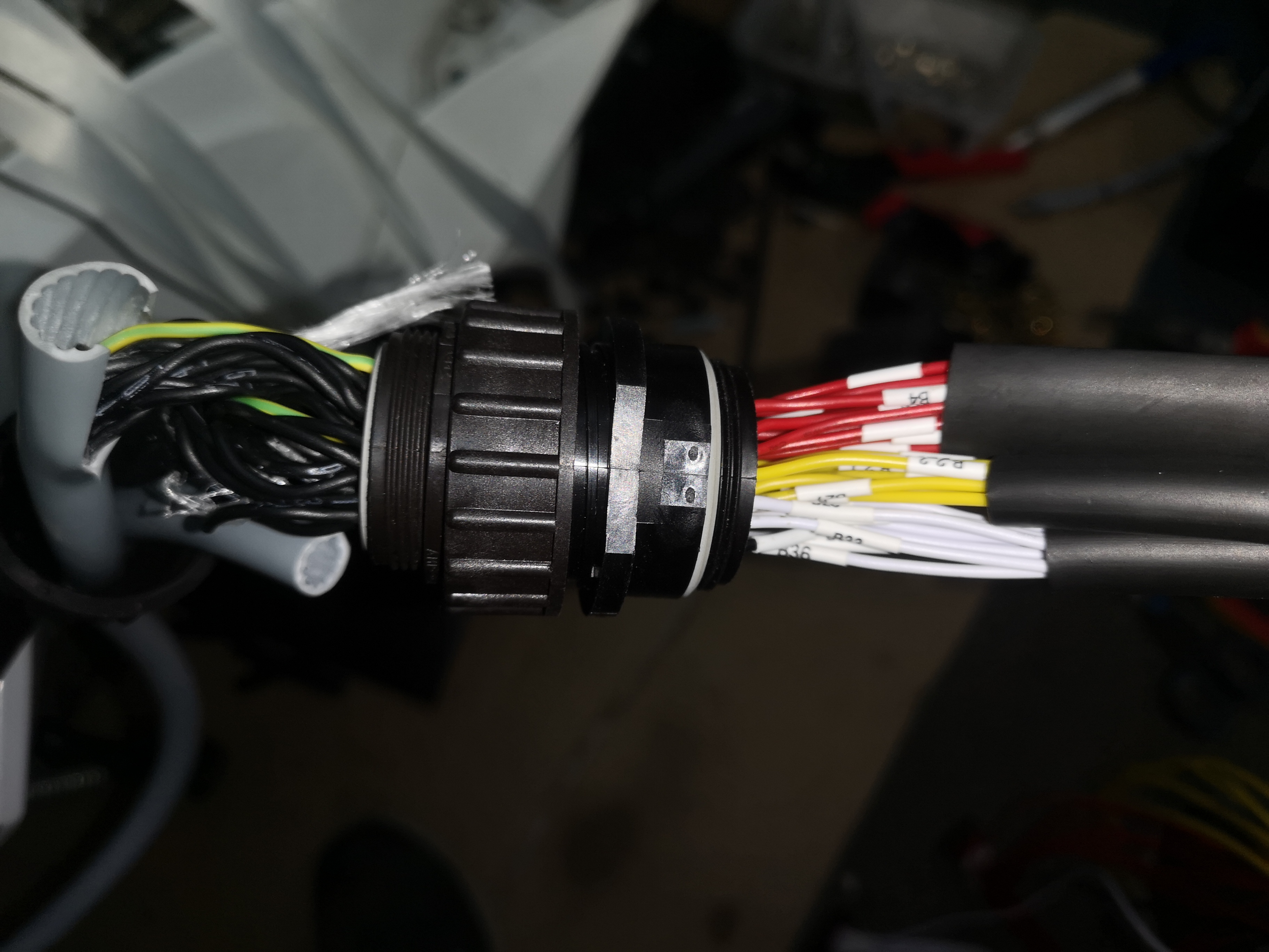Die Kabelstränge der einzelnen Ebenen führe ich in einer 37-poligen wasserdichten Kupplung zusammen, weil das BMS in einem Deckel sitzt. Wenn ich den später entferne, brauche ich nur die Kupplung zu trennen. Die Pole des Steckers sind ebenfalls durchnummeriert.