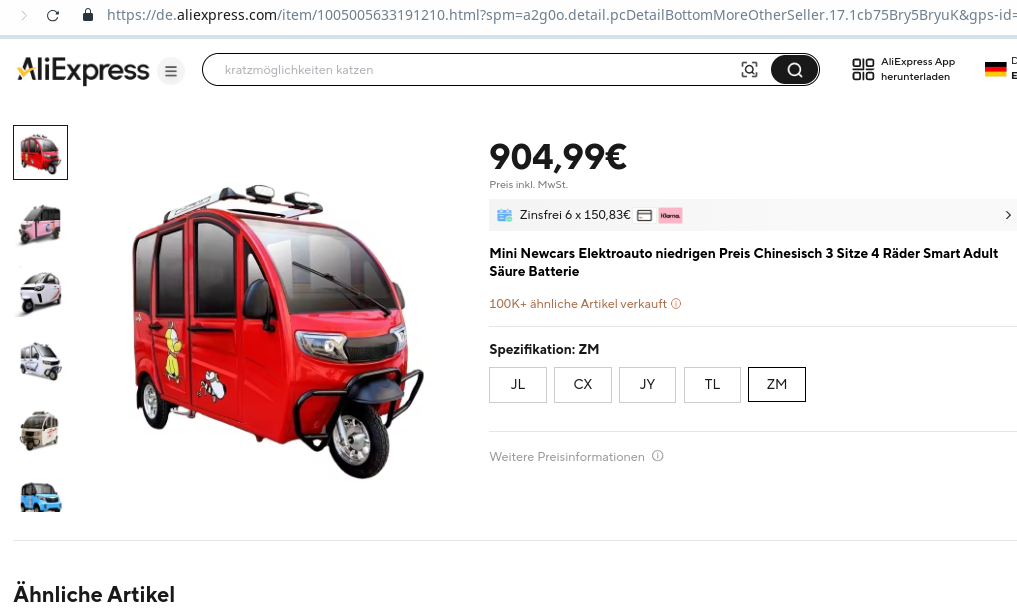 Es gibt bei Youtube die Videoreihe eines Amerikaners, der den kompletten Ablauf des Kaufs eines E-Motorrads aus China mit all den auftretenden Problemen verfilmt hatte. In summa summarum sehr unterhaltsam aber auch eine Warnung an alle Wagemutigen. Der hatte sich damals in 2019 nicht beirren lassen und sein Ding durchgezogen. Er wusste aber auch, wie er die Maschine nachzuarbeiten hatte.