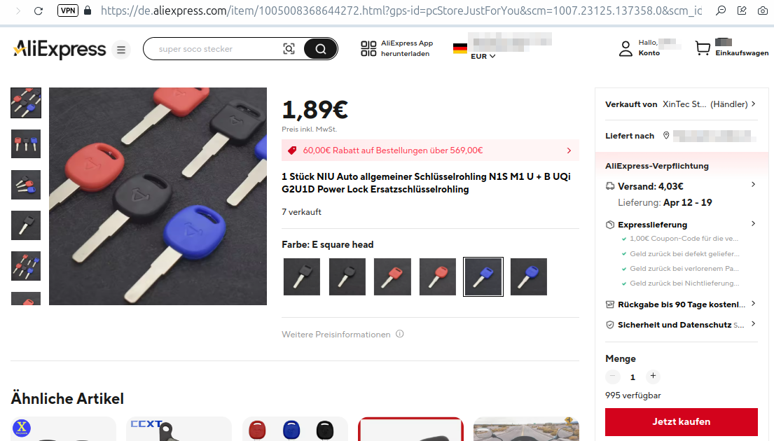 Also... ich habe jetzt doch noch eine relativ preisgünstige Quelle für meine Schlüsselkopie gefunden. Und zwar passen die Rohlinge für NIU-Schlösser auch für die von Nova-Motors (den SLI-5):