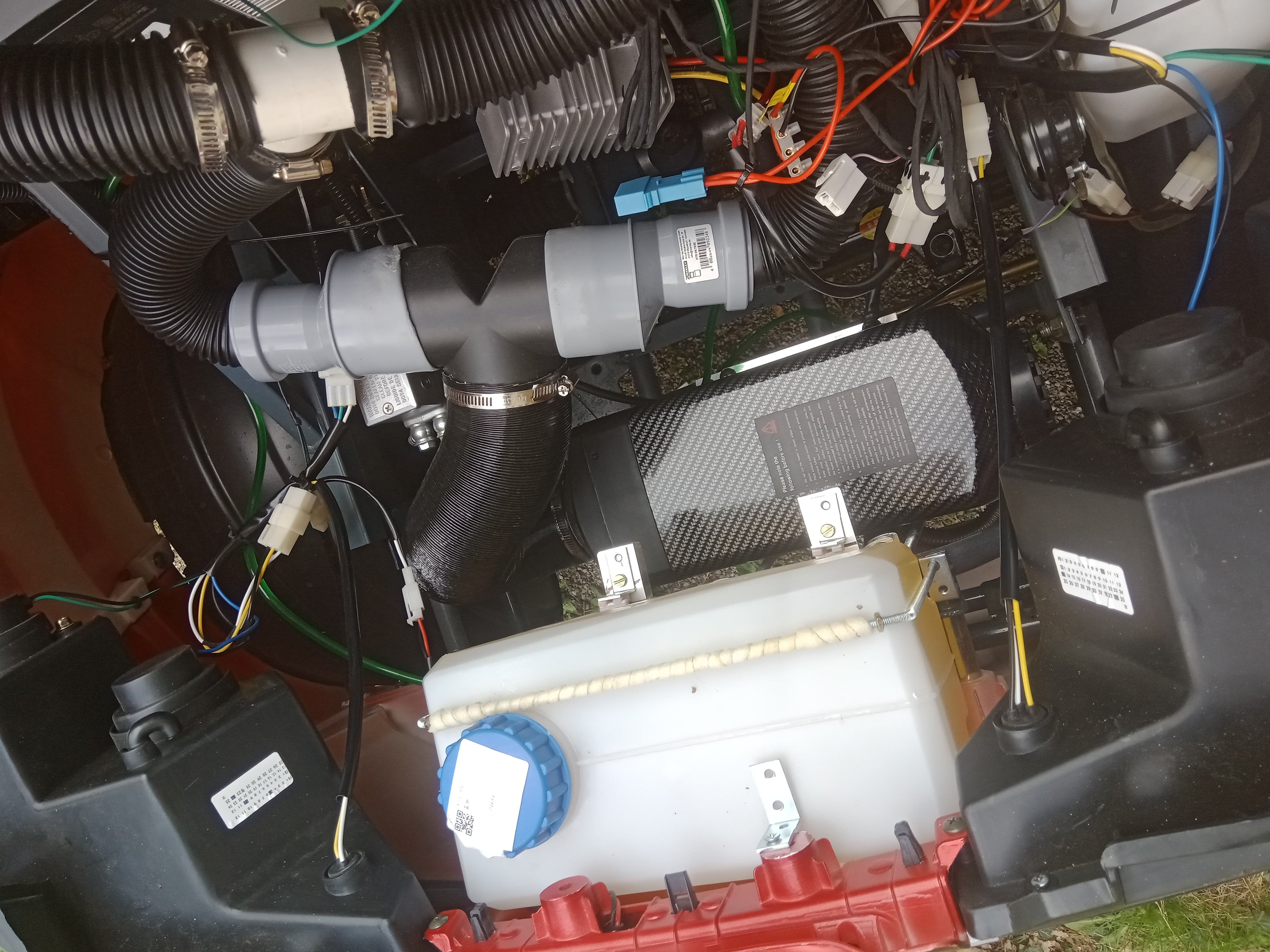 Aber 22°C reichten zum testen.Hatte Angst,das die Scheibe und Seitenverkleidungen schmelzen :lol: .Da der Auspufftopf vorn rechts unterm Fahrzeug ist und ich im Stand getestet habe,ist etwas Dieselgeruch in den Innenraum gelangt.Um das Bremspedal ist ja ein ordentlicher Schlitz zur Außenwelt,wo es auch etwas durchzieht.Mal sehen,wie ich das ändern kann.Ich werde auch mal schauen ob ich ein passendes Edelstahlwellrohr finde,um die Abgase nach hinten zu führen.Da der Brenner 2-3min. Abschaltzeit braucht um abzukühlen,werde ich noch eine direkte Spannungsversorgung vom Akku legen.Dann bleiben auch die Einstellungen gespeichert.Eine reine Lüfterfunktion ohne Heizung ist auch möglich übrigens.