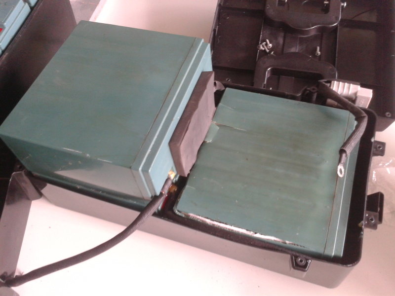 Mit einem Kollegen habe ich die beiden Akku-Blöcke, die unter dem Fußtriit und unter der Sitzbank untergebracht sind, ausgebaut und aufgeschraubt. In jedem Akku-Block sind vier einzelne Silikon-Akkus enthalten die hintereinander geschaltet sind und jeder Block scheint parallel geladen zu werden (insgesamt 48 V, 40 Ah).