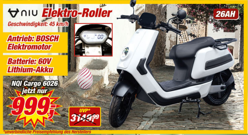 999 € für einen NIU-Roller mit Händler-Garantie ist schon eine Ansage! Vormaliger Preis: 1.299 €. Nun also nochmal 300 € günstiger zu haben.