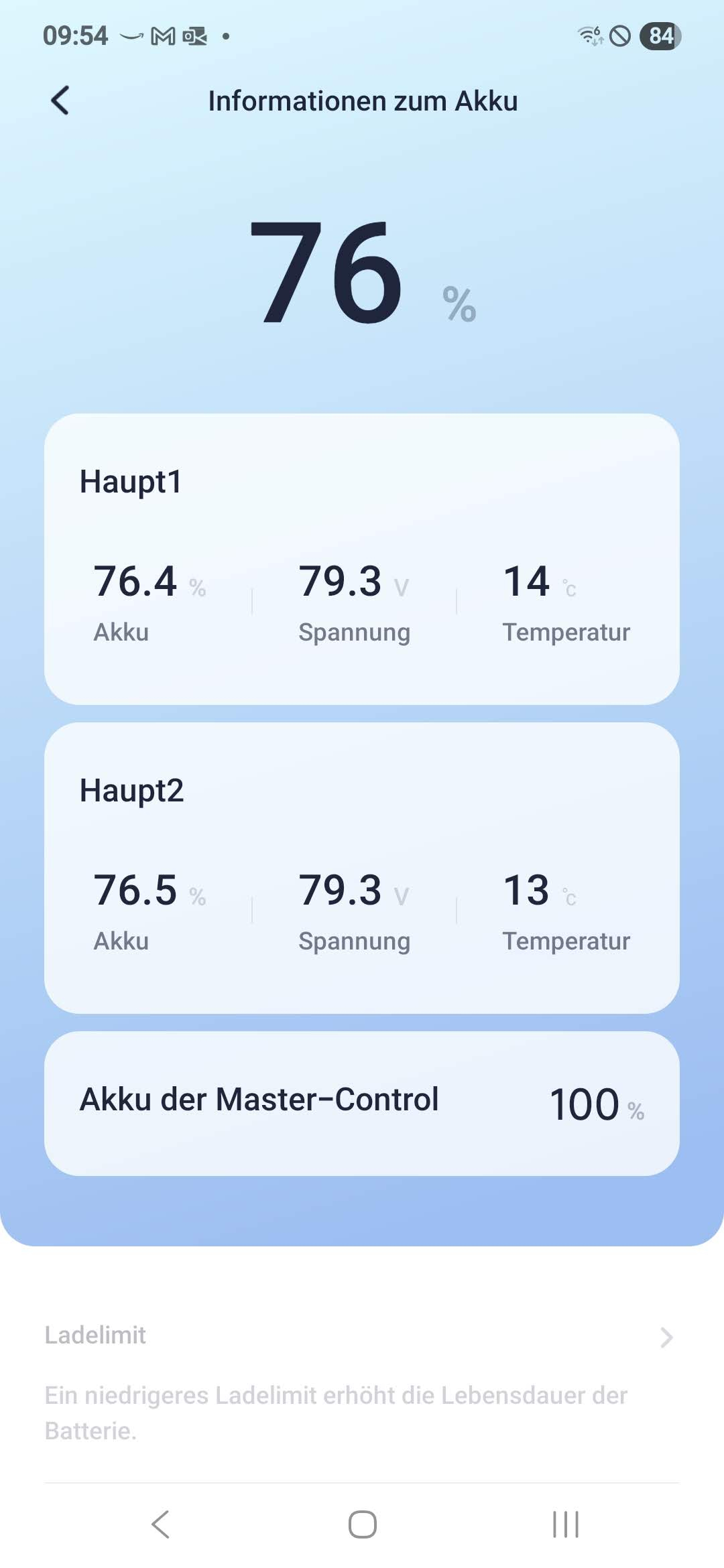 Laut deinem Screenshot ist nur ein Akku angeschlossen: es sollte ein Haupt1 und ein Haupt2 Akku sichtbar sein, darunter der Master-Control, siehe meinen aktuellen Screenshot.Rufter hat geschrieben: Mi 23. Apr 2025, 09:20 Es sind beide Akkus angeschlossen.