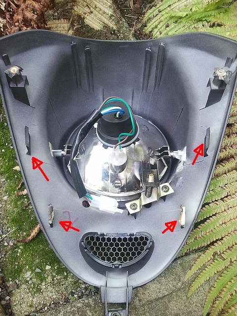 Als Erstes klappst du das UNU Logo nach oben, somit kannst du die Schraube lösen, bzw. entfernen Nun entfernst du die zwei Schrauben, welche auf der Seite des Zündschlosses sind, rechts und links oben Jetzt wird es etwas "zarter", denn du musst mit deiner Hand (Fingern) den Ausschnitt mit dem Frontscheinwerfer vorsichtig "ausklipsen".