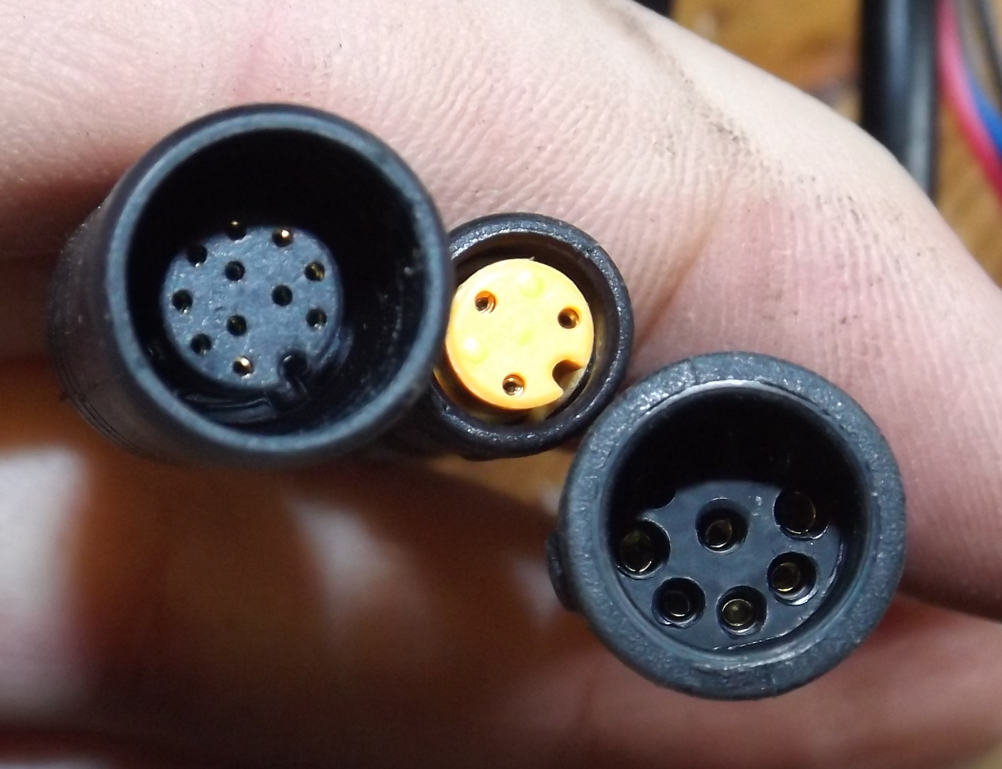 Gut, wir kommen in der Erkenntnis weiter. Leitung zum Motor hat Stecker mit 9 Pin und drei davon Länger, weil dort mehr Strom fließt, als auf den übrigen Adern. Kein Zweifel, dass es ein Brushless-Motor ist und die drei Phasen laufen über die langen Pins. Bleiben sechs weitere Pins von denen mindestens fünf belegt sein müssen, für Stromversorgung Hall-Sensoren (Plus und Minus) und die drei Hall-Sensor-Signalkabel. Ob da noch ein sechster Pin belegt ist, z.B. zu Messung Motor-Temperatur, spielt für die Reaktivierung keine Rolle.