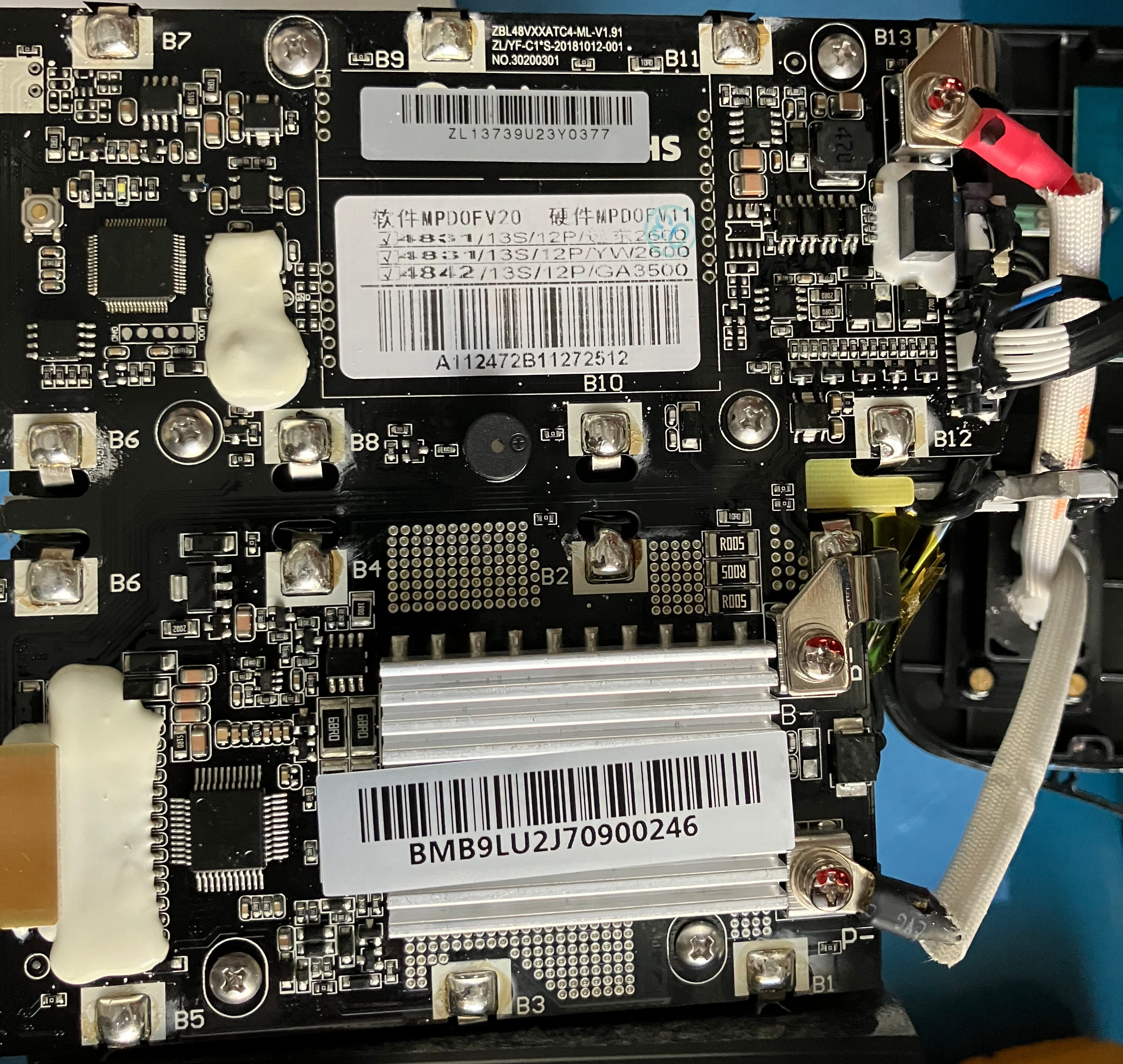 Von B13 nach P- ist aber nix zu messen, hier hat das BMS nach meiner Meinung ausgeschaltet. Ist da noch was zu retten, BMS defekt? Neu anlernbar? Kennt sich jemand aus, gibt es Schaltpläne? Google spuckte mir mit der Bezeichnung der Leiterplatte zunächst nichts aus.