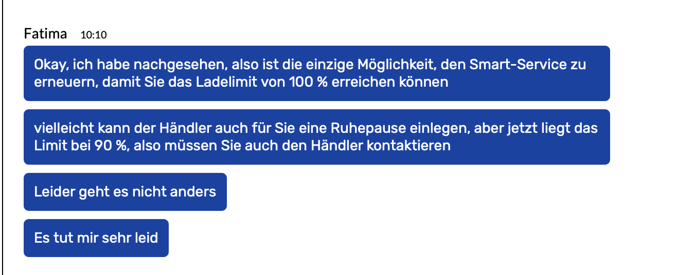 In der App kann das Ladelimit nur auf 70% abgesenkt werden - meine ich. Nachschauen kann ich das nicht mehr, da mein Smart-Service beendet ist. Den Kundendienst per Chat kann man wirklich vergessen. Die verweisen nur auf den Händler. Und der Händler bietet zwar an, das mit der Händler App zu ändern, nur leider sitzt dieser über 700km entfernt.
