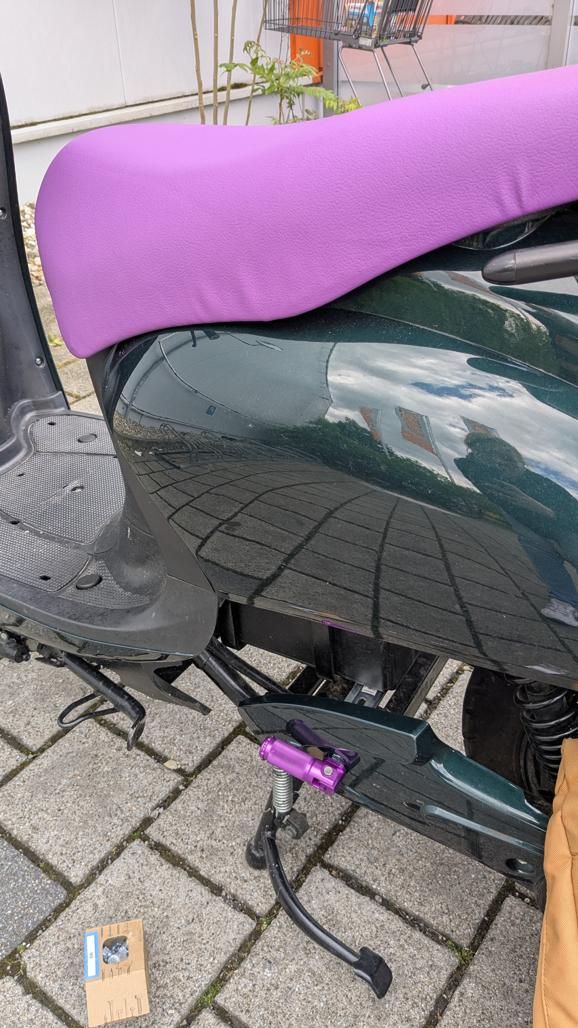 Falls jemand nach Unterstützung fürs Sattel neu beziehen sucht, kann man mir gerne schreiben. War auf jeden Fall alles gut machbar und ich persönlich finde die Farbkombi von dem dunklen Grün mit dem Lila mega