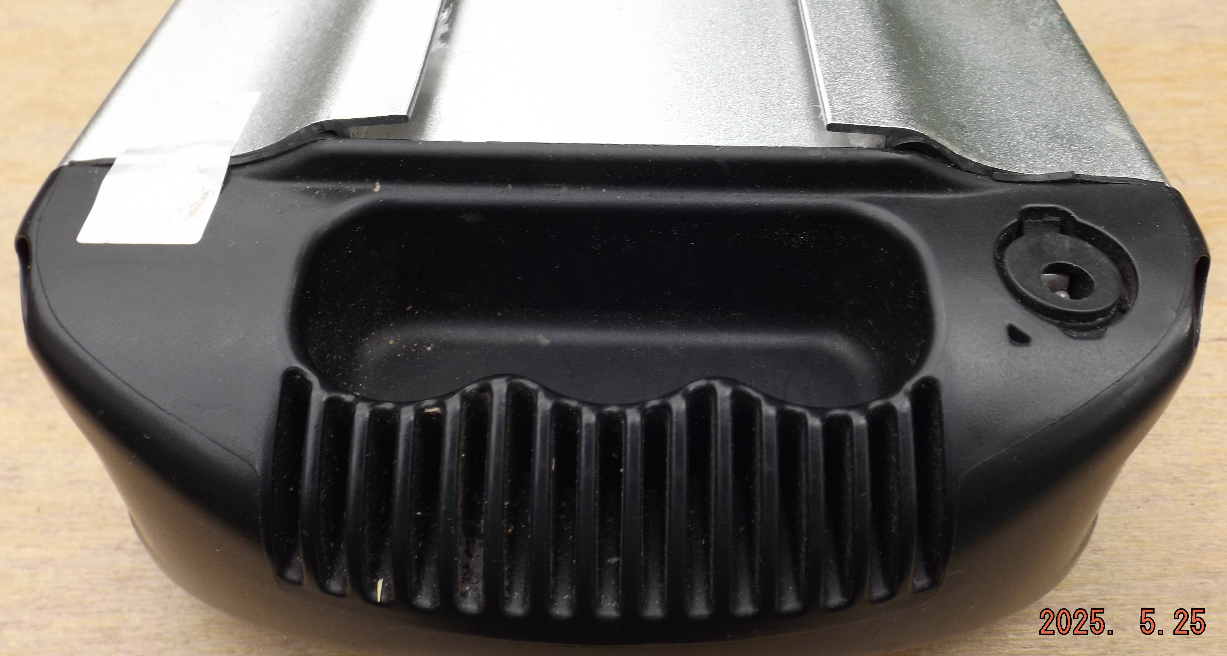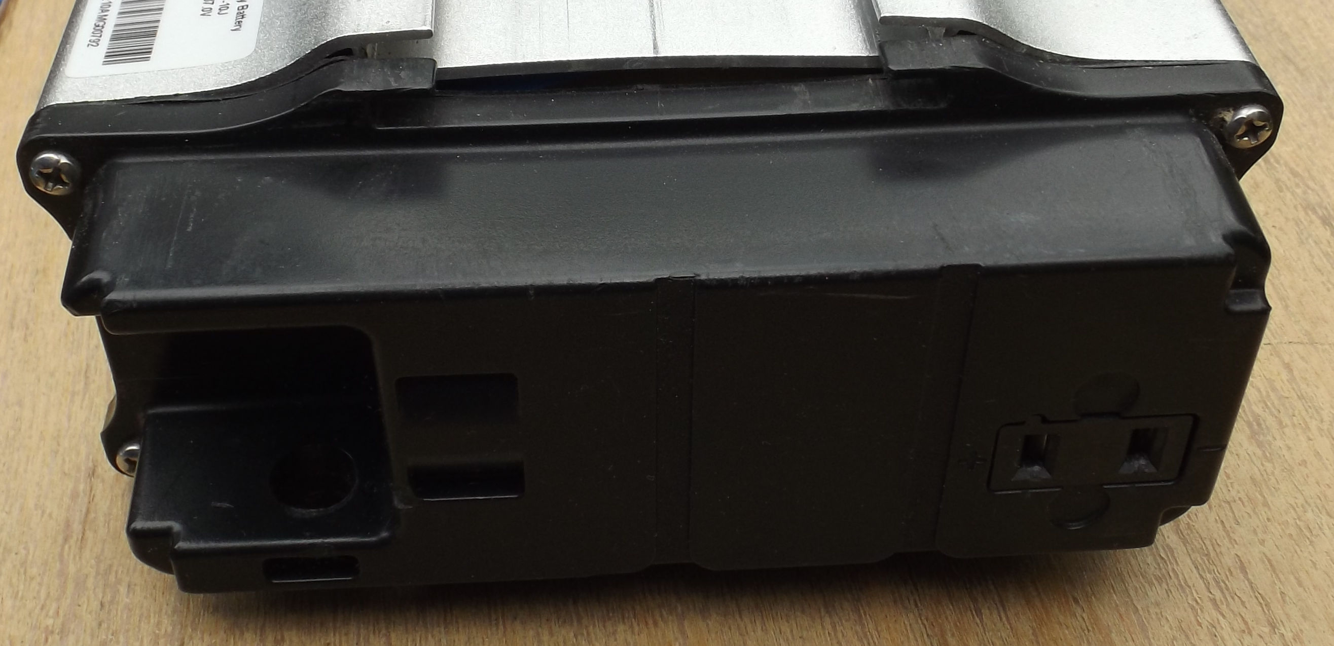 Das ist das andere Ende des Akkus, wo der Stecker des Ladegeräts eingesteckt wird. Das Foto zeigt die Unterseite - die sieht normal aus. Dreht man den Akku um...
