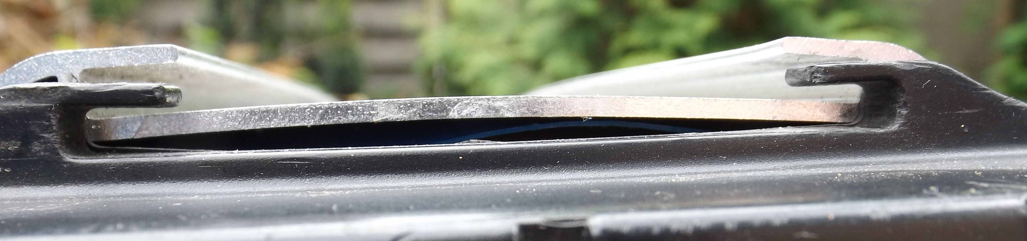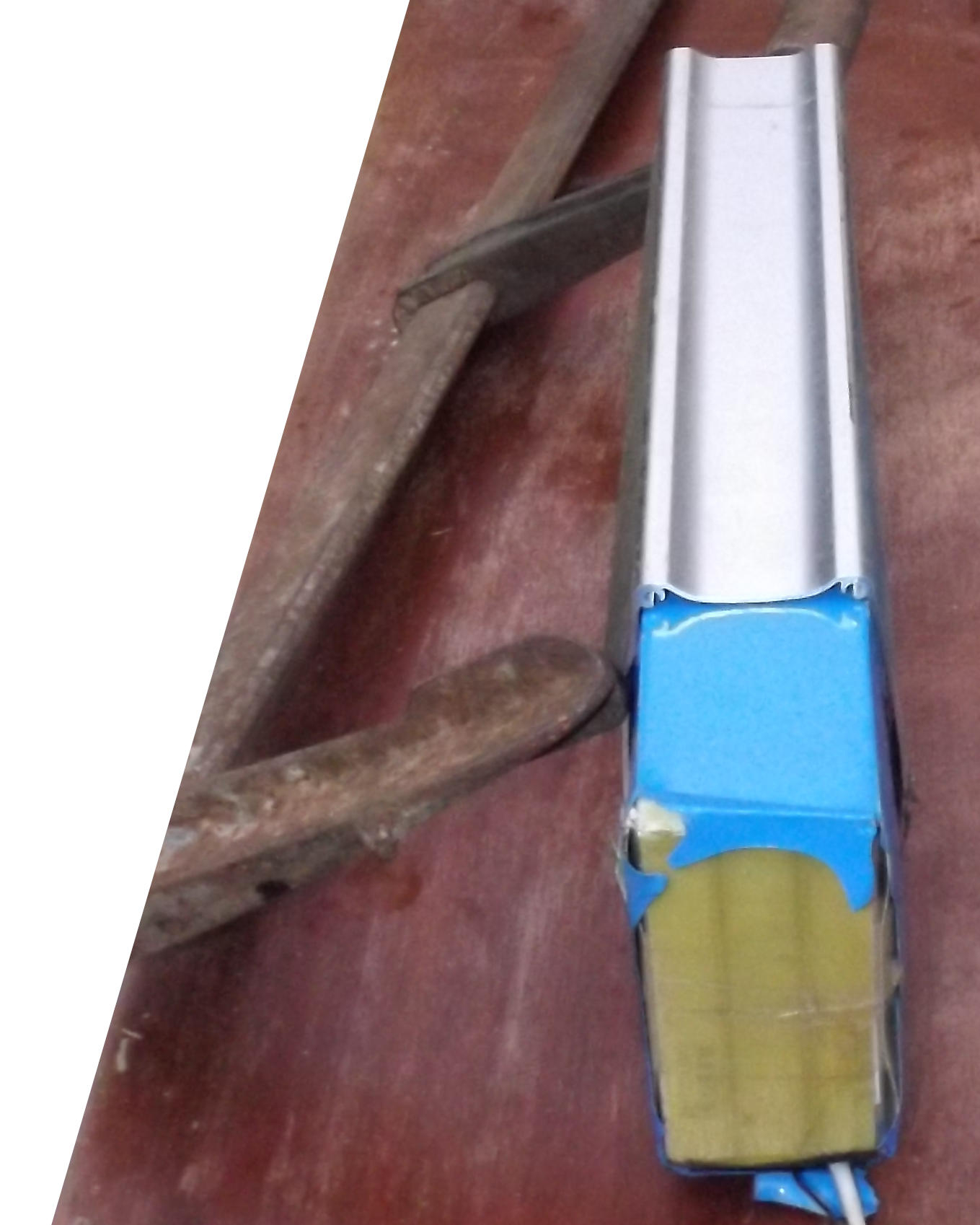 Von der Seite sieht man die Katastrophe: Das Aluminium-Blech ist um mehr als seine Dicke abgehoben. Innen, als blauer Streifen erkennbar, ist der aufgeplatzte Schrumpfschlauch. Hier ist Hopfen und Malz verloren. Jetzt geht es nur noch darum, wie es innen aussieht, und was man mit der Ruine noch anfangen kann.