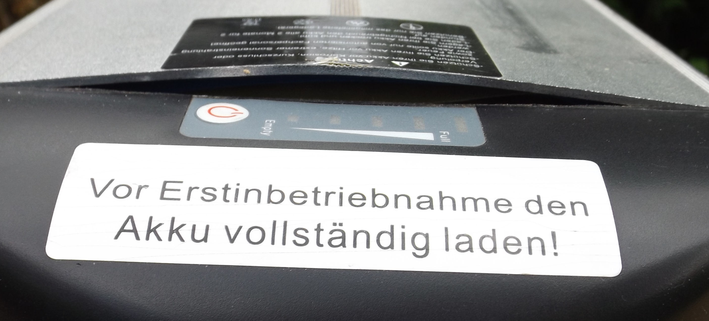 Das Ende mit Handgriff, Stromeingang und (rechts) Ladungsanzeige. Oben links jetzt zu sehen: die Schrift auf dem Kontrollaufkleber.